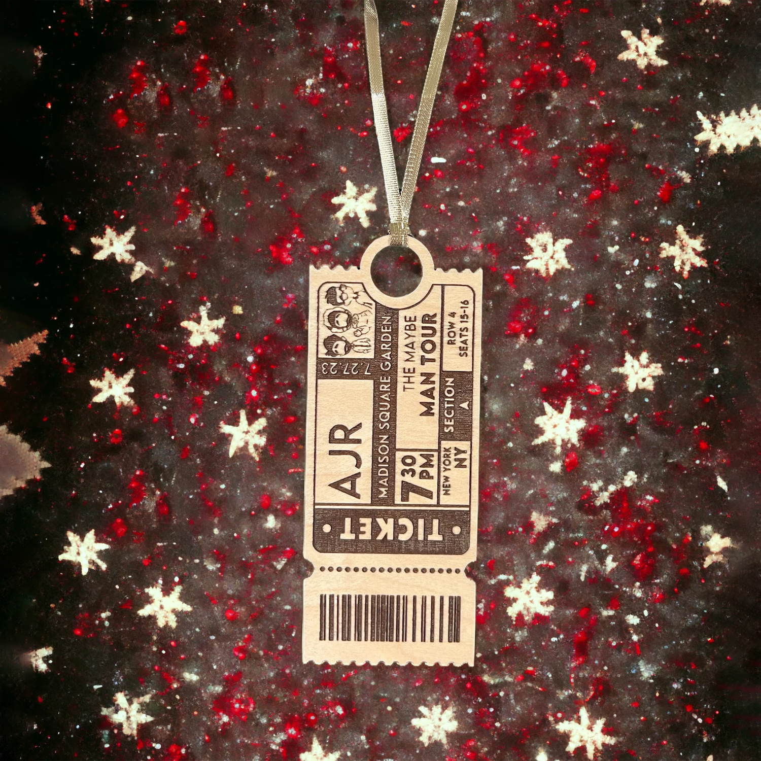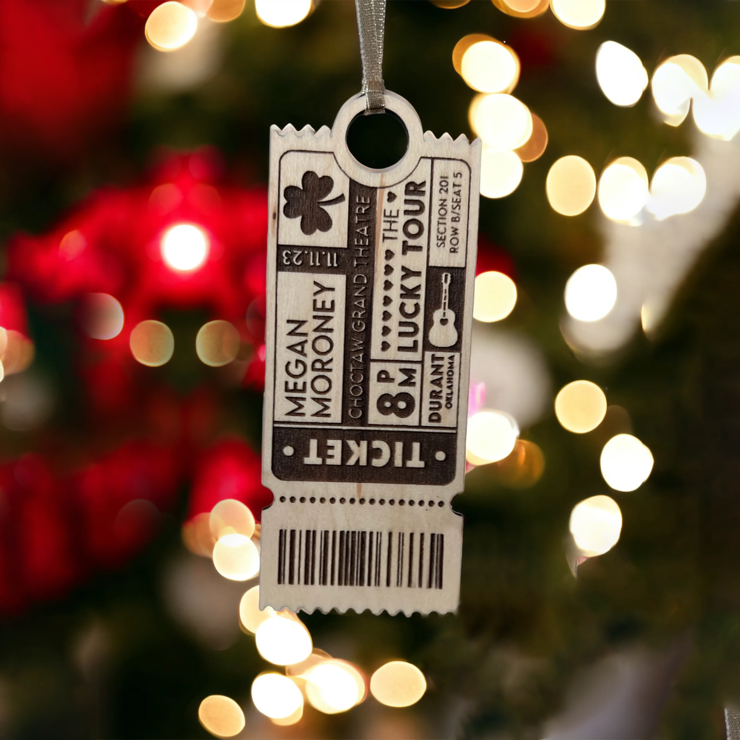 This engraved wooden Christmas ornament is fully customizable (excluding the barcode) with your concert information. Provide AS MUCH detail as possible in the personalization section so that the ornament is as personalized as possible.