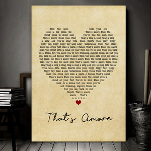 "That's Amore" captures the essence of falling in love, with lyrics that evoke imagery of romantic moments shared between partners. The heart design symbolizes the passion and connection that defines romantic relationships, making this print a perfect tribute to love.