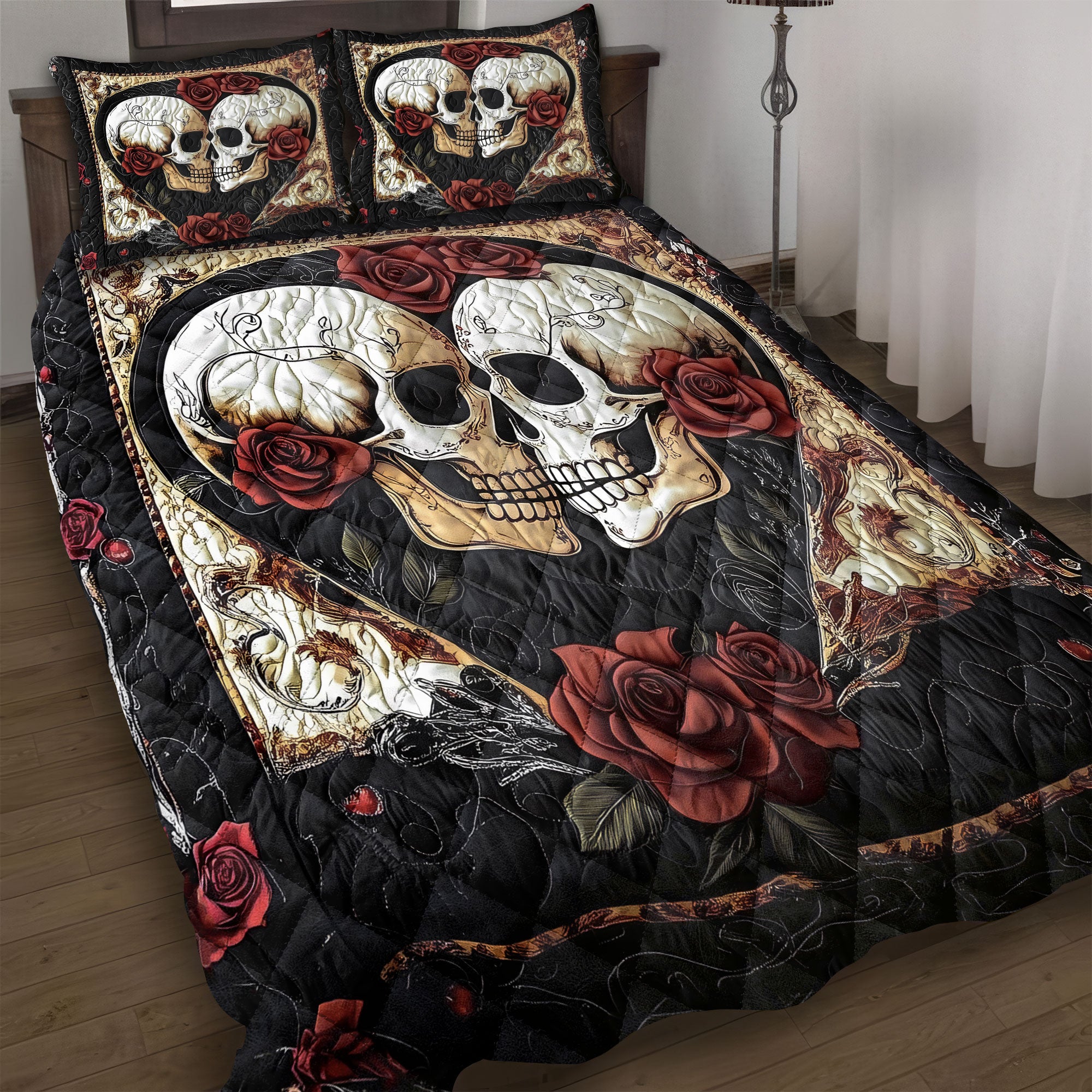 Celebrate your unique love story with the Eternal Love Skull Couple Quilt Bed Set. Featuring a bold and striking skull design, this bedding set symbolizes an unbreakable bond between you and your partner. Perfect for couples who love a mix of romance and edgy style, this set is ideal for Valentine’s Day, newlyweds, or any couple looking to make a statement in their bedroom. With its stunning design and high-quality fabric, this quilt set will keep you cozy and in love, all while adding a touch of fierce elegance to your decor.