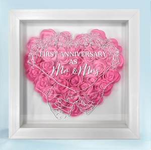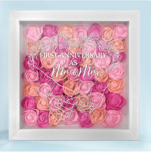 Celebrate the love and commitment of your first year together with the "Couple First Anniversary As Mr. & Mrs. - Personalized Flower Shadow Box". This beautiful and unique keepsake features a custom design with the couple’s names and the date they became Mr. and Mrs., framed by delicate, preserved flowers. It’s a heartfelt and meaningful way to commemorate a milestone in your relationship.