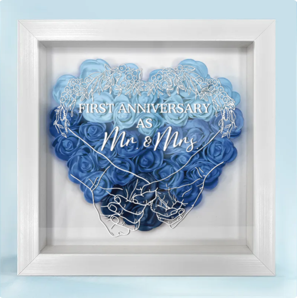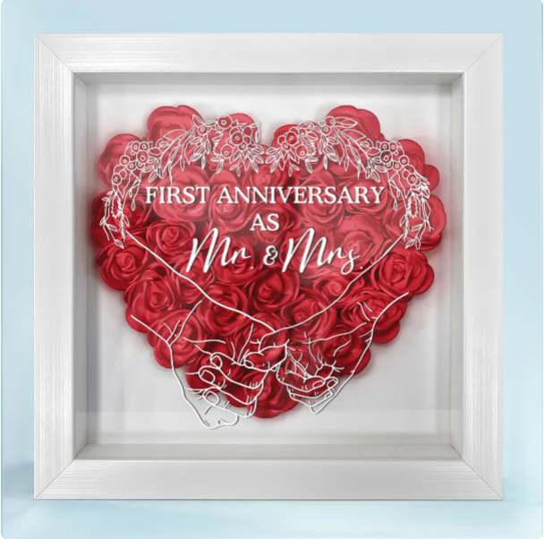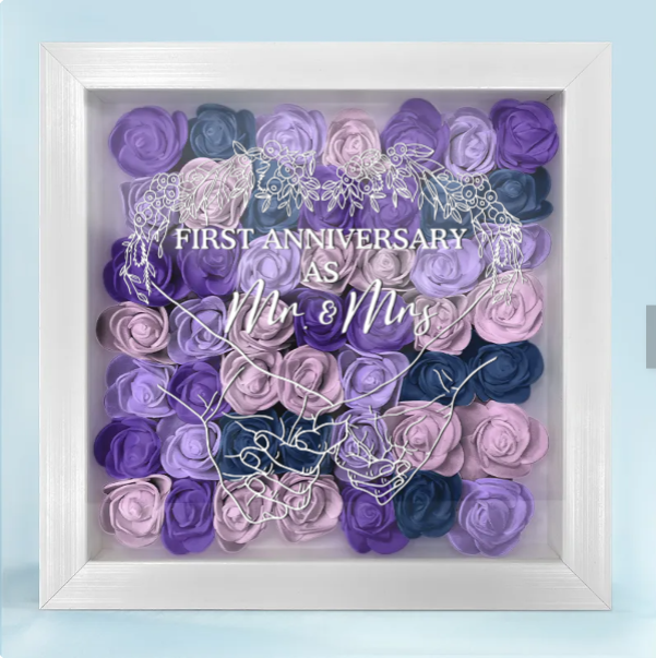 This personalized shadow box is a perfect gift for your husband or wife to celebrate your first anniversary, offering a romantic and thoughtful reminder of the bond you share. Its timeless design makes it a cherished piece for any home, ideal for displaying in the living room, bedroom, or even a personal space like a home office. The beautiful flowers and custom details make this an unforgettable gift that will be treasured for years to come, evoking the memories of your first year of marriage every time you see it.