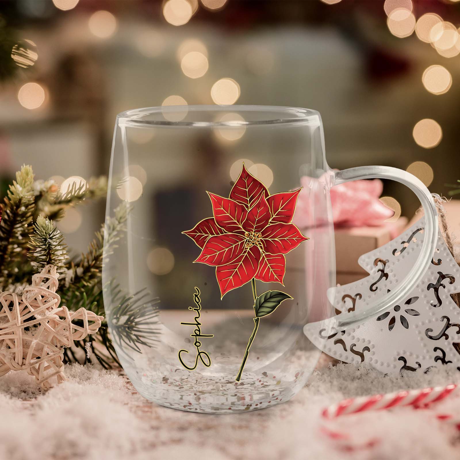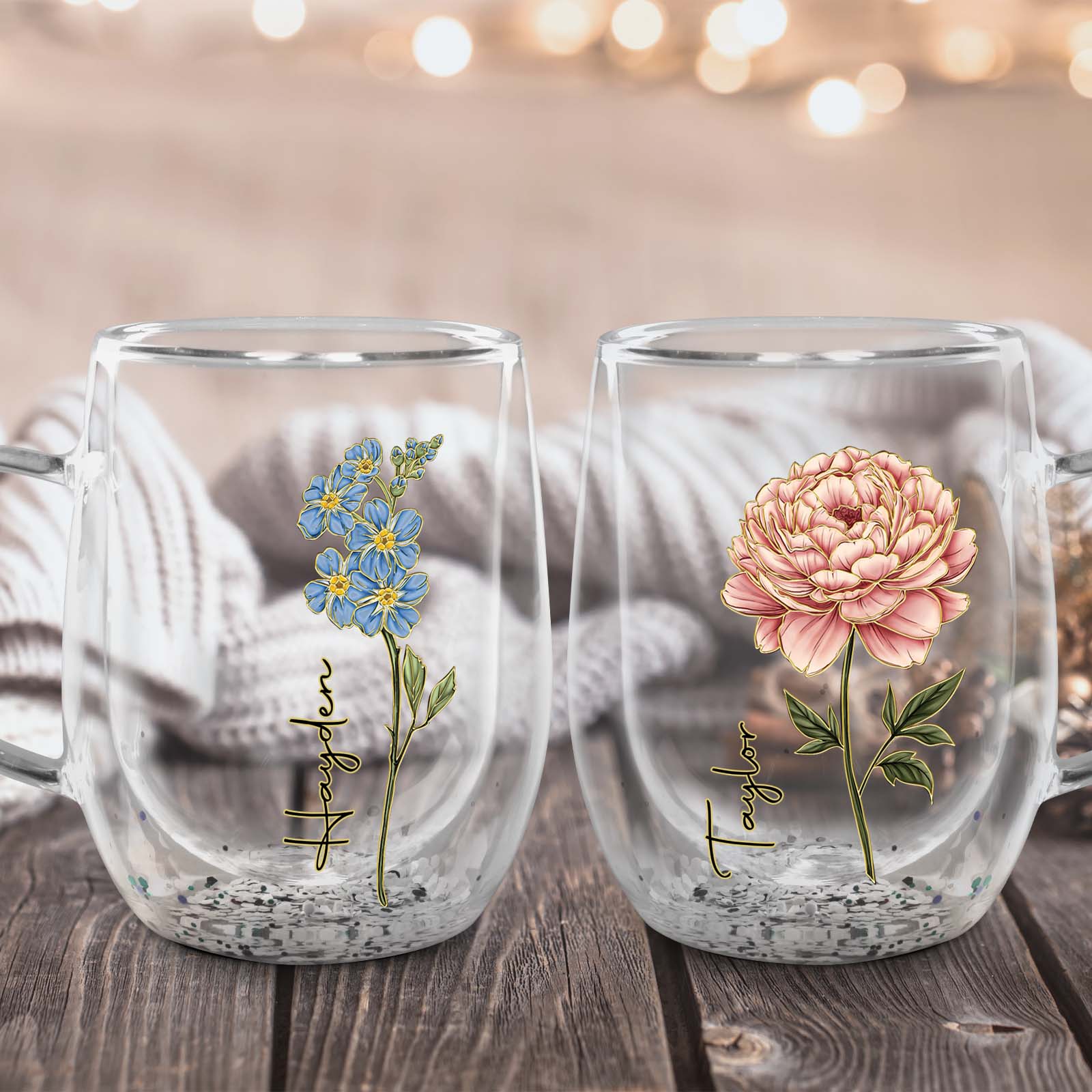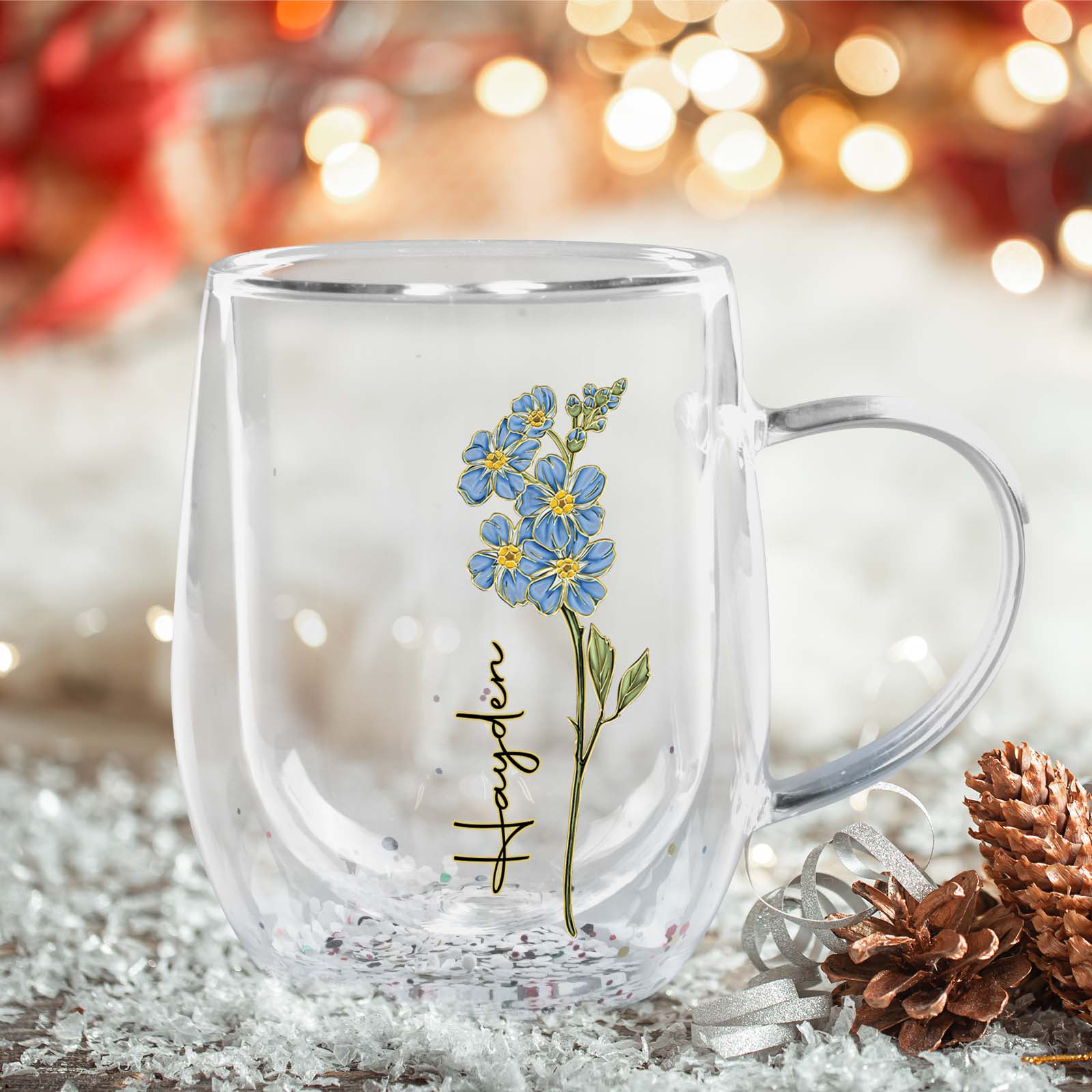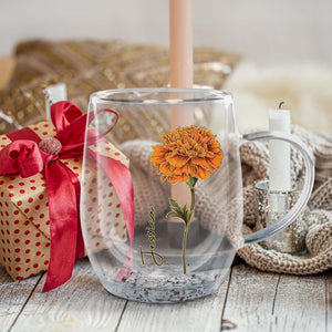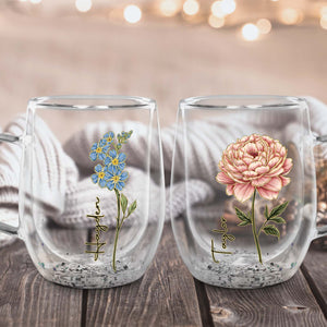Flower Personalized Double Walled Glass Mug, Mother's Day Gift, Gift For Bestie