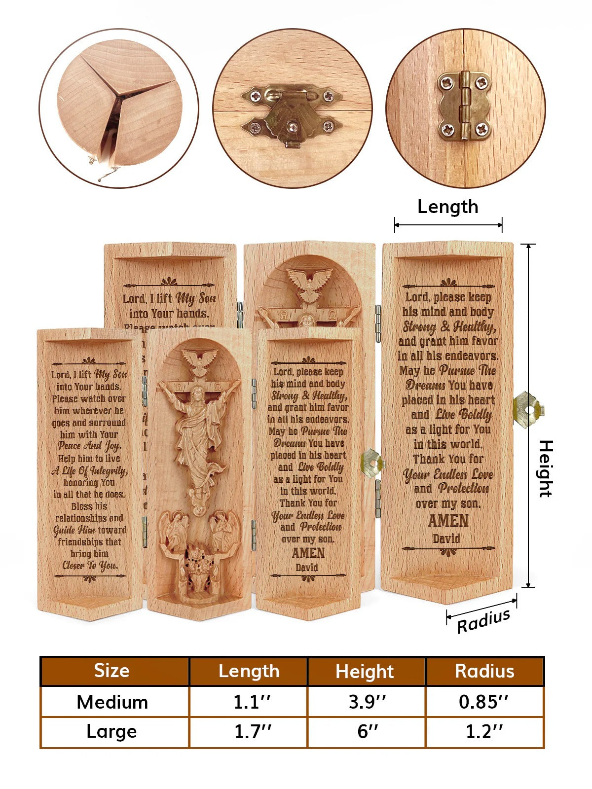 God Protect My Son, Personalized Openable Wooden Cylinder Sculpture of Jesus Christ, Christian Gifts is a meaningful and unique Christian gift, designed to capture the essence of love and faith. Crafted from high-quality wood, this cylinder sculpture is intricately engraved with the image of Jesus Christ, symbolizing divine love and devotion. The openable feature allows for a personal message or photo to be added inside, making it a thoughtful keepsake for couples, families, or individuals dedicated to their Christian beliefs.
