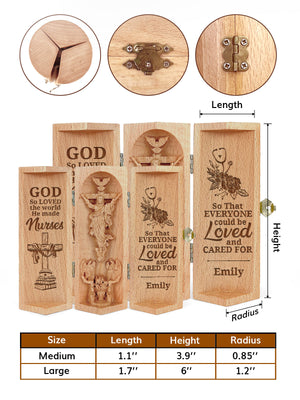 This intricately crafted wooden sculpture is a heartfelt tribute to faith and family. The product features a beautifully designed cylindrical wooden container that opens to reveal a 3D depiction of Jesus Christ on the cross, surrounded by angels and a dove symbolizing the Holy Spirit.