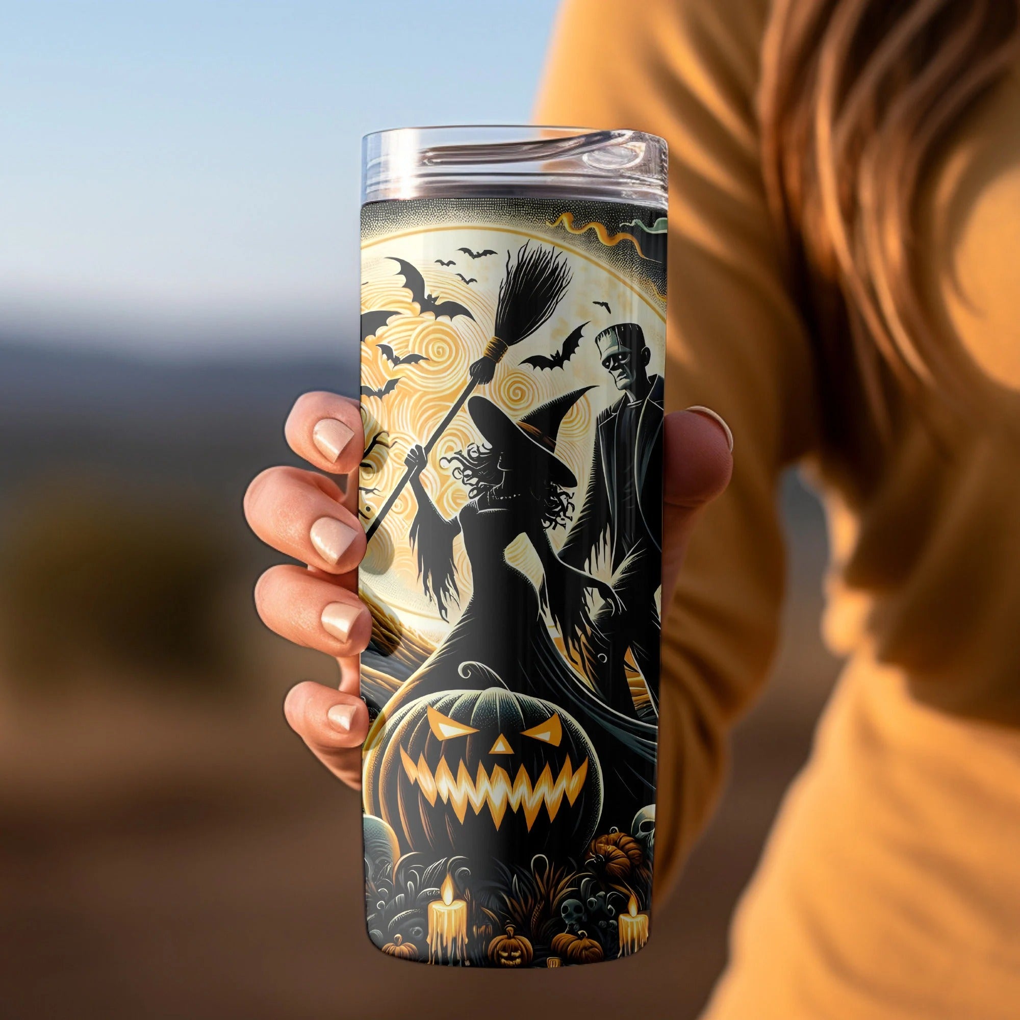 Lid: Comes with a secure, spill-resistant lid with a sliding closure, making it easy to sip your drink without worrying about spills. Designed to be leak-proof, it’s ideal for travel, outdoor use, or spooky night adventures.