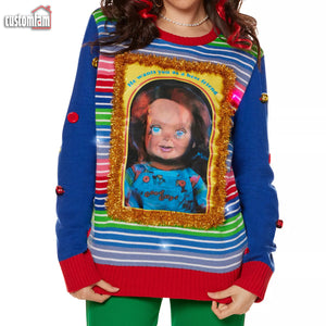 Get ready to combine the spooky charm of Halloween with the festive cheer of Christmas with this Halloween Horror Movie Light Up Ugly Christmas Sweater. This unique pullover is the perfect way to showcase your love for horror movies while getting into the holiday spirit. It's the ideal outfit for ugly sweater parties, holiday gatherings, or simply adding a bit of frightful fun to your Christmas wardrobe.