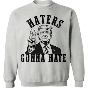 This shirt design features a bold black-and-white illustration of Donald Trump making a peace sign with his hand. Above him, the word "HATERS" is displayed in a large, serif font with a distressed, grunge style, giving it a rough, vintage look. Below the illustration, the phrase "gonna hate" is printed in the same font and style, completing the phrase in a bold and edgy way. The minimalist black-only color scheme makes the design striking and visually impactful, delivering a strong statement with a simple yet powerful aesthetic.