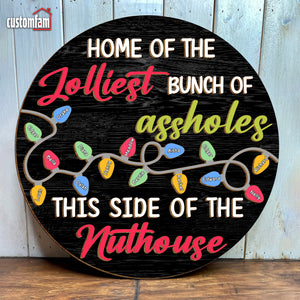 - The sign features the fun and cheerful phrase "Home Of The Jolliest Bunch," inspired by classic holiday movies and festive traditions. It captures the lighthearted nature of the holiday season, creating a cozy and welcoming atmosphere. The whimsical font and playful design elements like snowflakes, Christmas trees, or holly berries add to the festive charm.