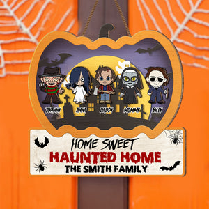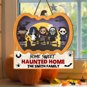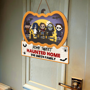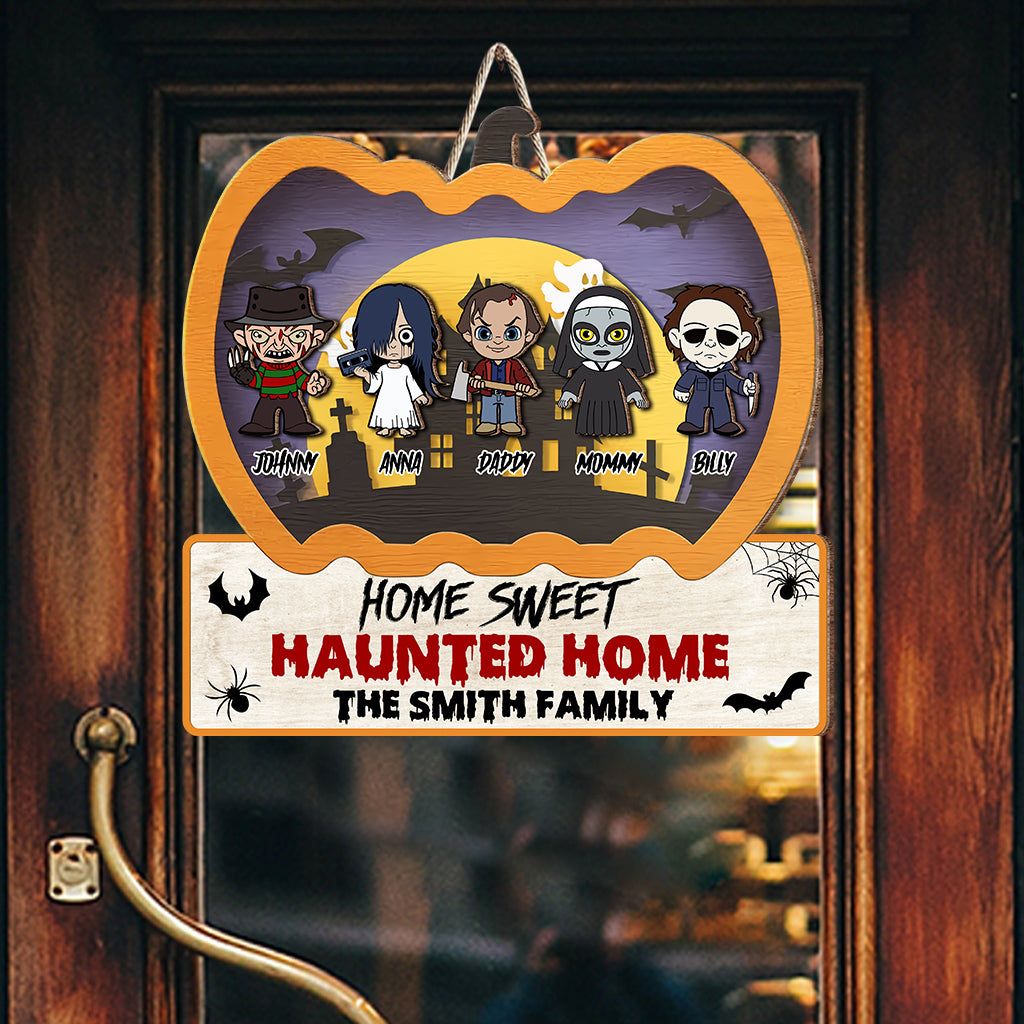 Home Sweet Haunted Home Custom 2 Layered Halloween Pumpkin Horror Wood Door Sign, Horror Fan Gifts