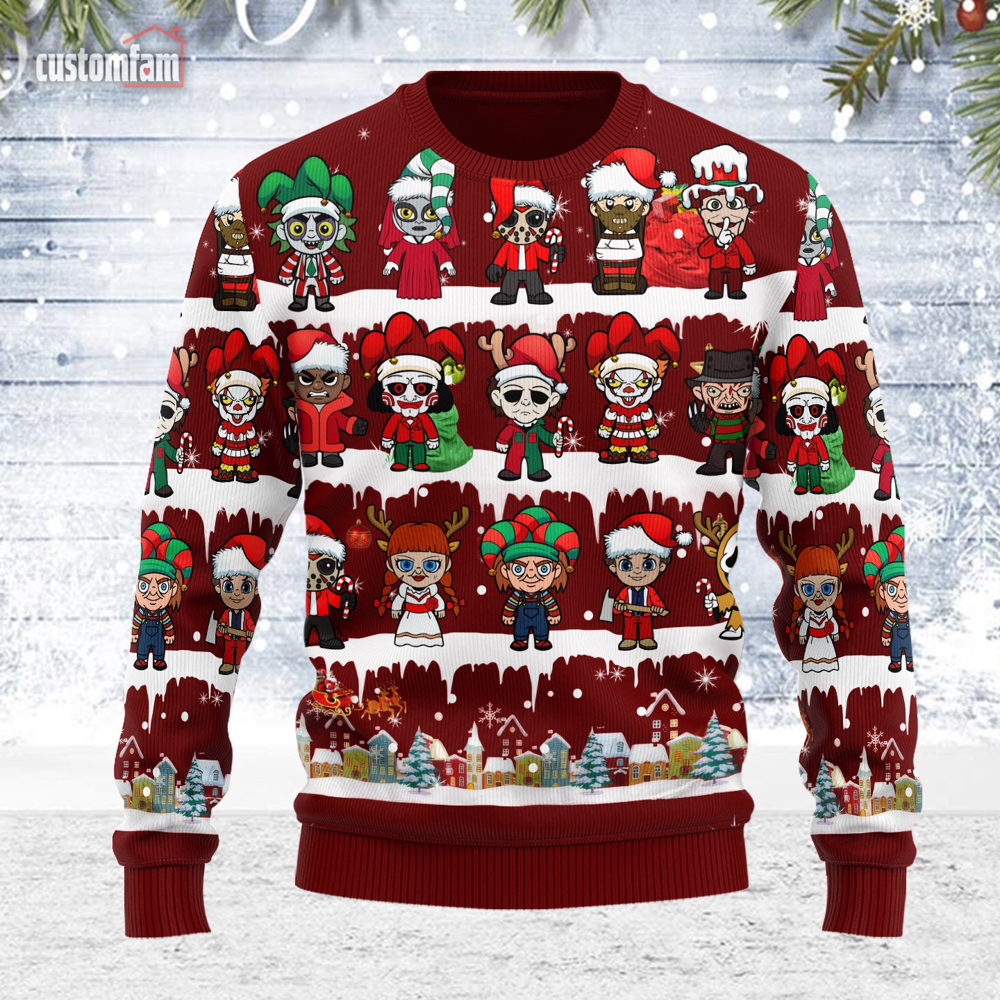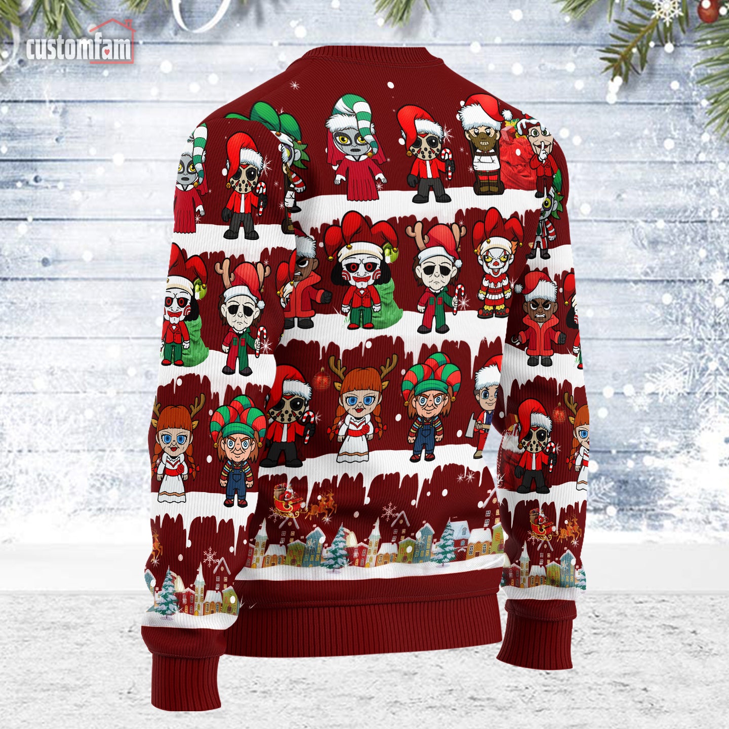 Whether you’re attending an ugly sweater party, cozying up for a Christmas movie marathon, or giving it as a gift to horror-loving friends or family, this personalized sweater is sure to make a statement.