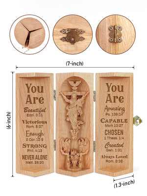 This intricately crafted wooden sculpture is a heartfelt tribute to faith and family. The product features a beautifully designed cylindrical wooden container that opens to reveal a 3D depiction of Jesus Christ on the cross, surrounded by angels and a dove symbolizing the Holy Spirit.