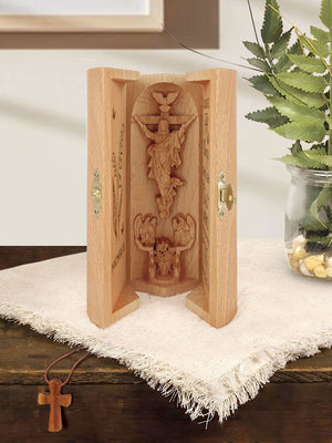 This intricately crafted wooden sculpture is a heartfelt tribute to faith and family. The product features a beautifully designed cylindrical wooden container that opens to reveal a 3D depiction of Jesus Christ on the cross, surrounded by angels and a dove symbolizing the Holy Spirit.
