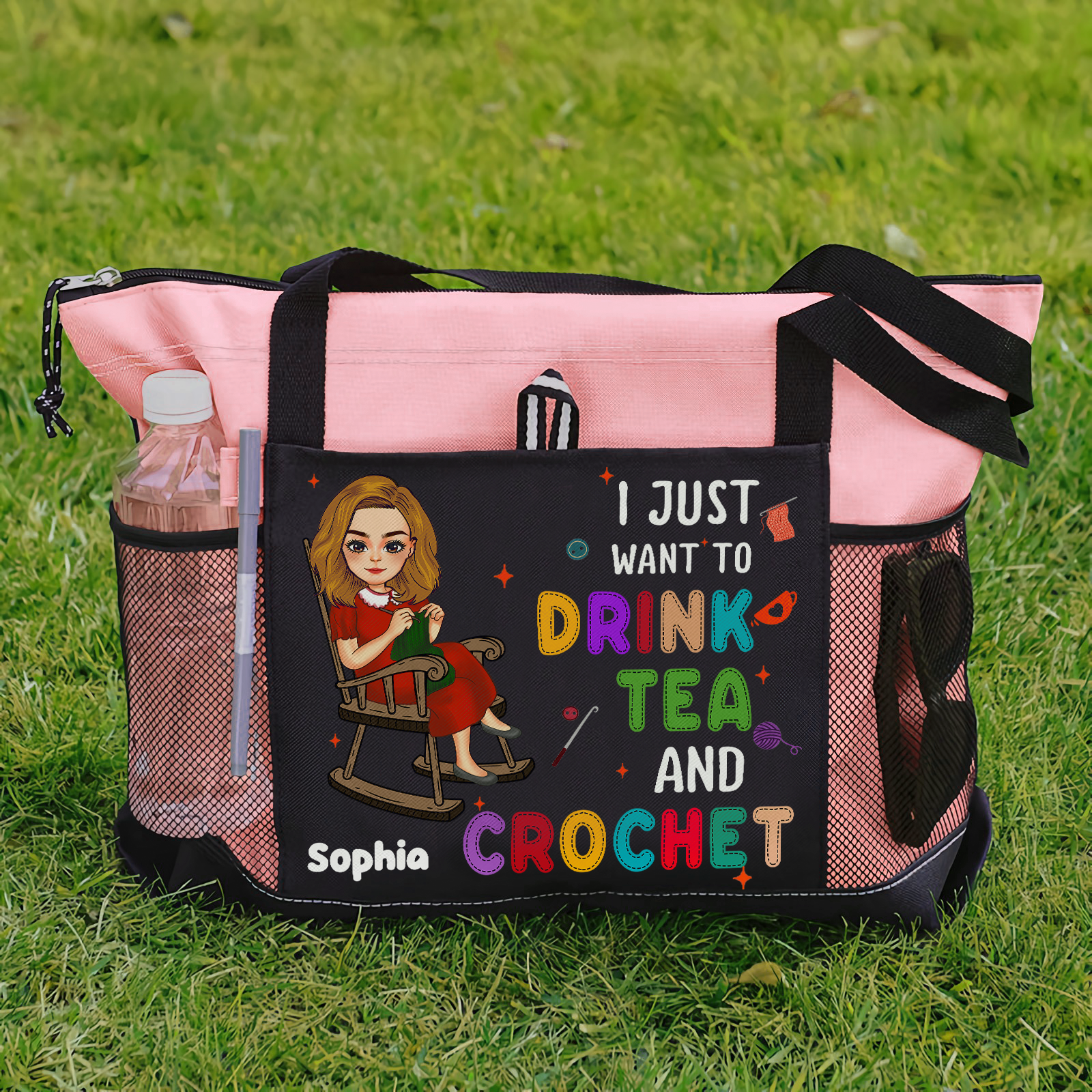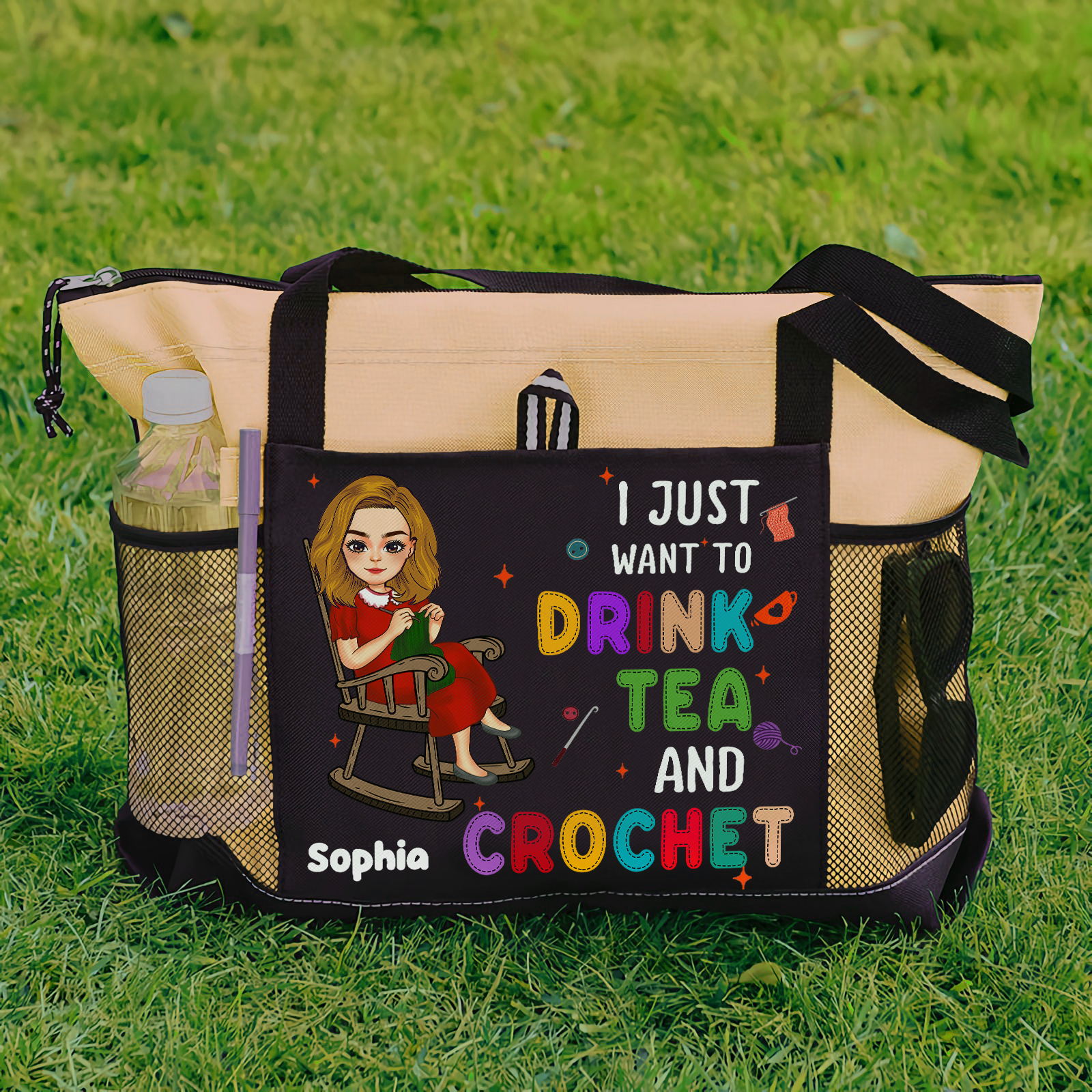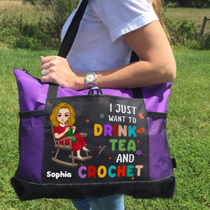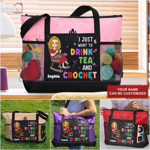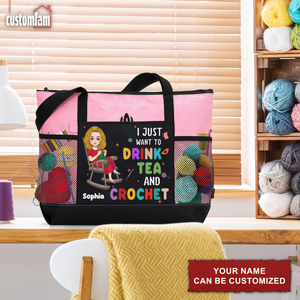 The tote features a delightful design with the quote "I Just Want To Drink Tea And Crochet" capturing the spirit of yarn lovers everywhere. The bag also includes multiple pockets and compartments to keep your supplies organized and easily accessible.