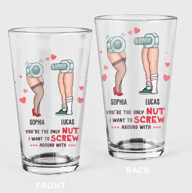 Show your love with a humorous twist with the "I'm 'Steel' Nut About You" Pint Glass. This playful pint glass is perfect for couples who appreciate a little wit in their relationship. Featuring the clever "I'm 'Steel' Nut About You" design, complete with a nut and screw graphic, it’s an ideal gift for your boyfriend, girlfriend, husband, or wife. Whether you're celebrating Valentine's Day, an anniversary, or simply want to add a little fun to your daily routine, this personalized pint glass will keep the laughs—and your drinks—flowing. You can even customize it with your names or a special date, making it a truly unique and memorable gift.