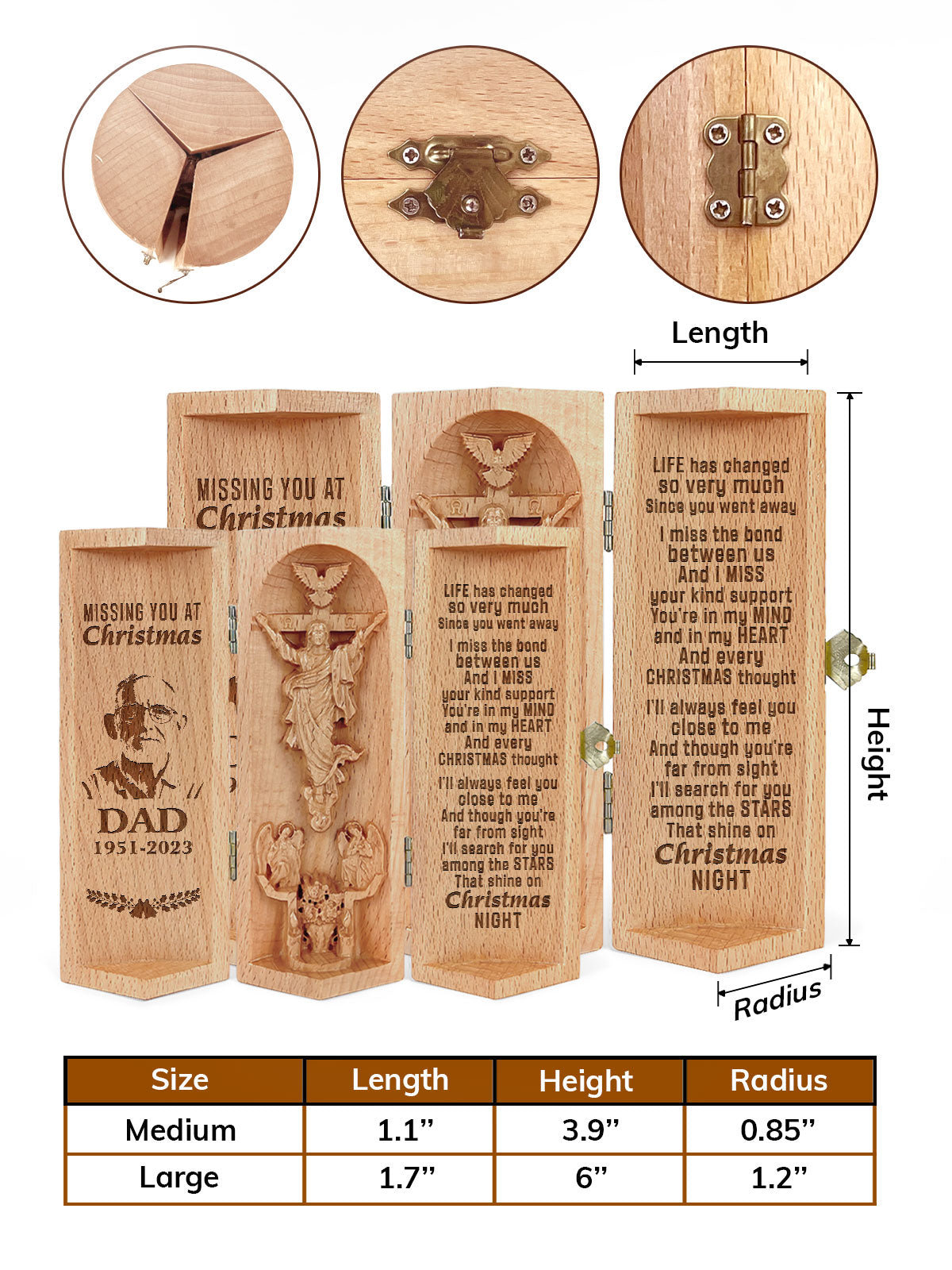 This intricately crafted wooden sculpture is a heartfelt tribute to faith and family. The product features a beautifully designed cylindrical wooden container that opens to reveal a 3D depiction of Jesus Christ on the cross, surrounded by angels and a dove symbolizing the Holy Spirit.