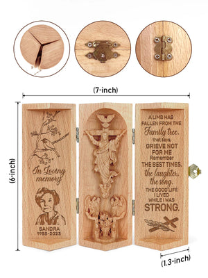This intricately crafted wooden sculpture is a heartfelt tribute to faith and family. The product features a beautifully designed cylindrical wooden container that opens to reveal a 3D depiction of Jesus Christ on the cross, surrounded by angels and a dove symbolizing the Holy Spirit.