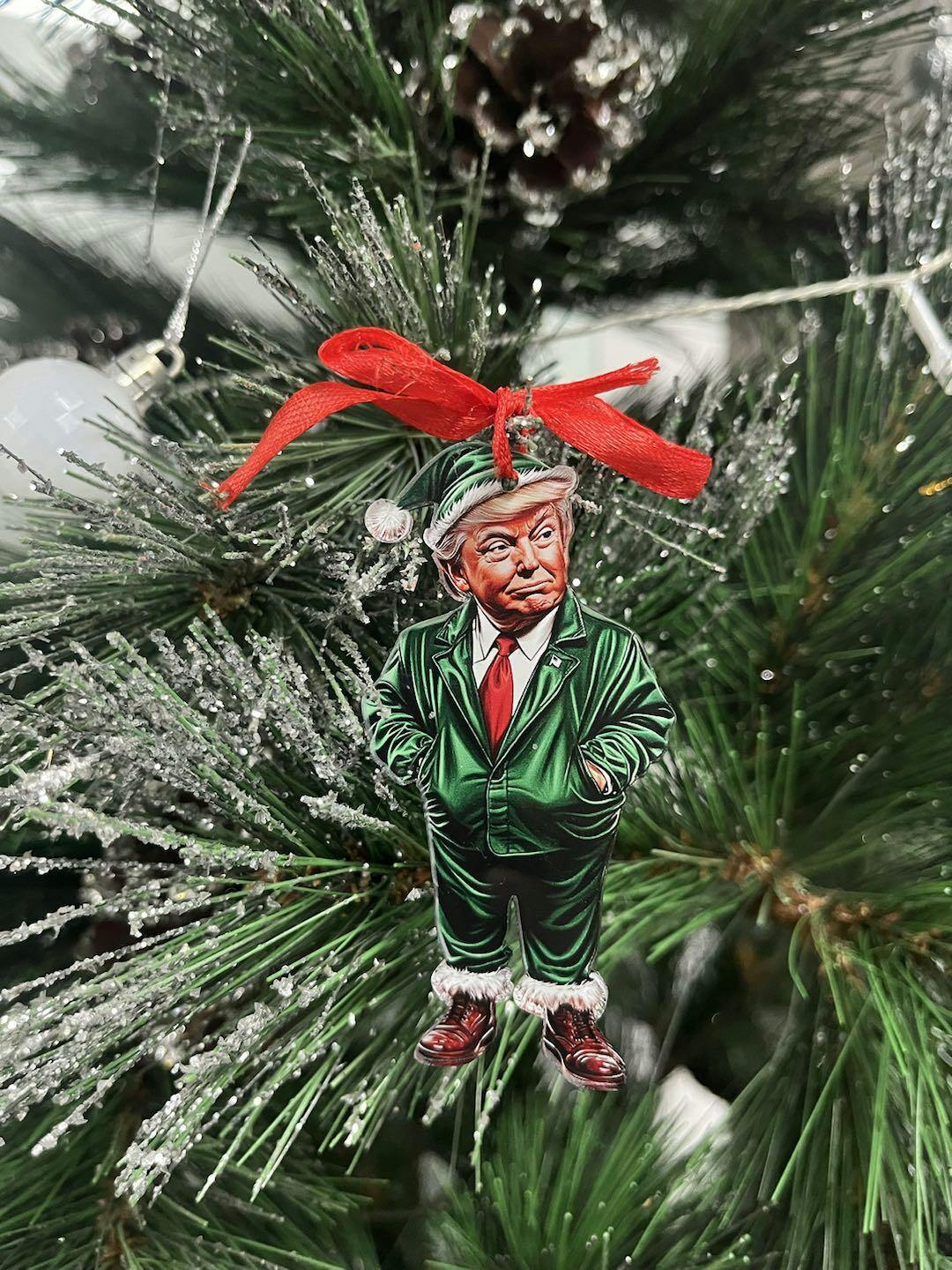 Show your support this holiday season with our Christmas Trump Acrylic Ornament. This unique ornament is perfect for Trump supporters looking to add a patriotic touch to their holiday decorations, whether on their car or Christmas tree.