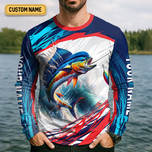 Made with lightweight, breathable polyester, it's built to handle both sun and splash. The vibrant all-over print brings your fishing lifestyle to life, while the UV Protection UPF 30+ keeps your skin safe under the open sky. Whether you're casting from a boat or kicking back at the dock, this shirt is your go-to gear for comfort and style.