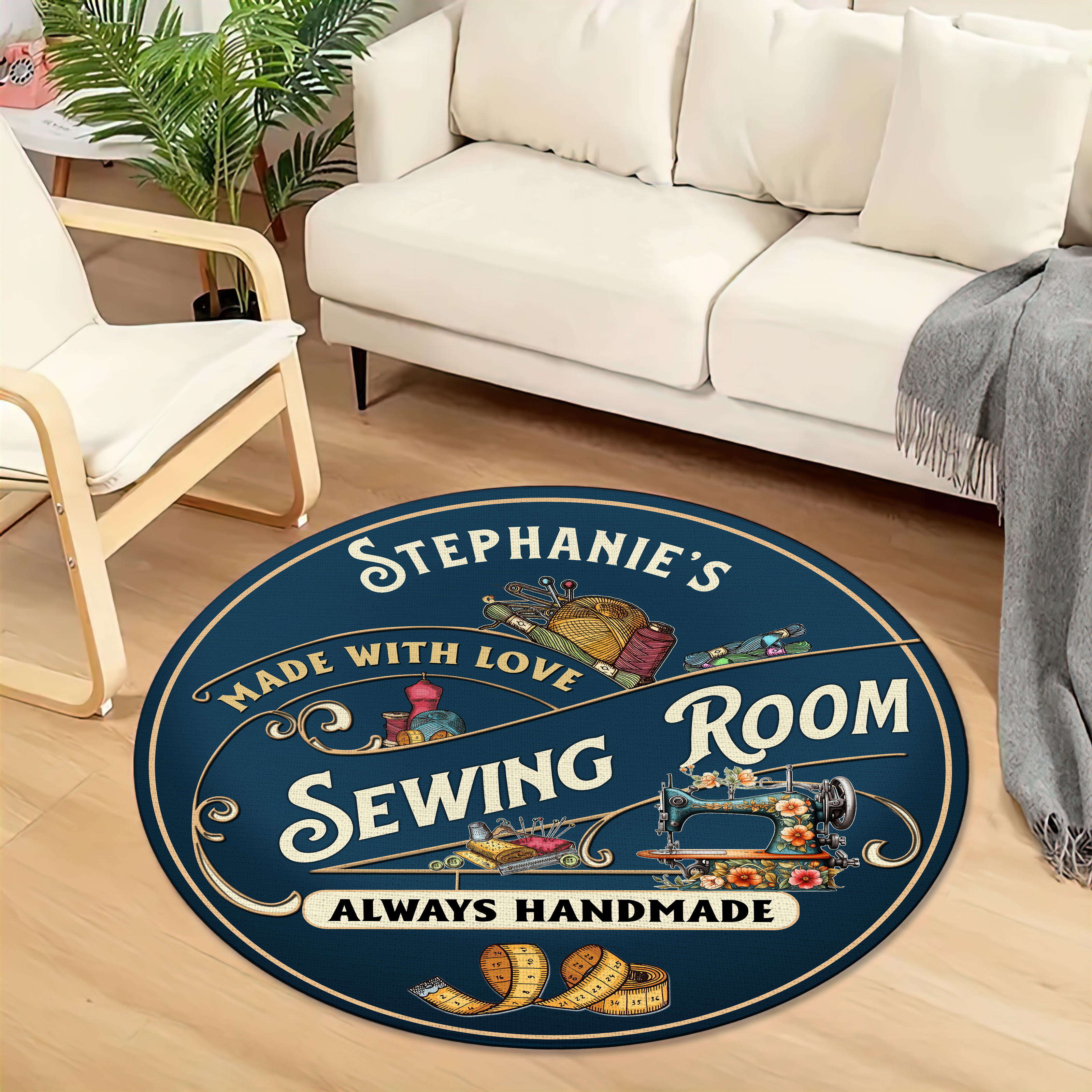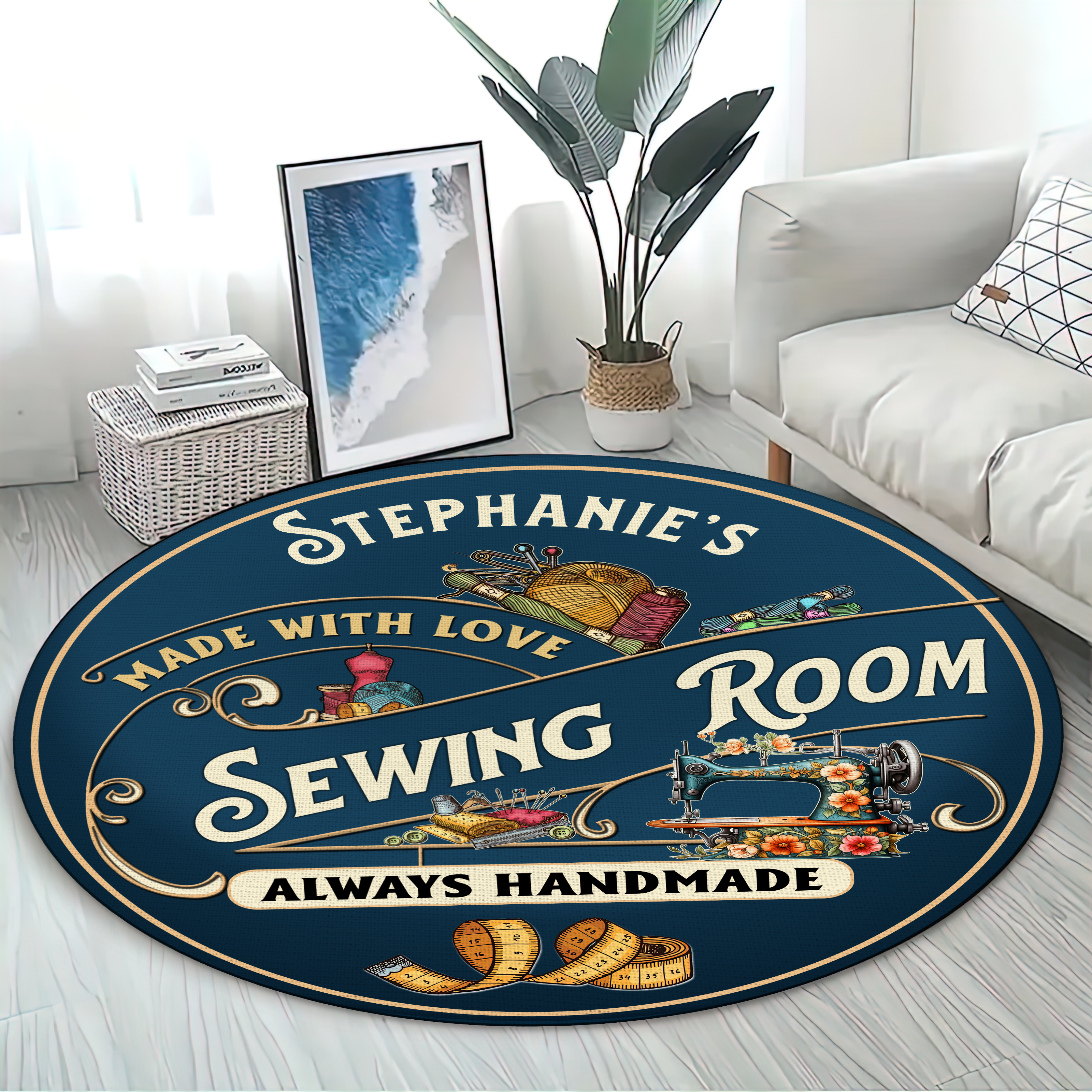Made With Love Sewing Room Personalized Round Rug, Sewing Lovers Gift, Craft Room Decor