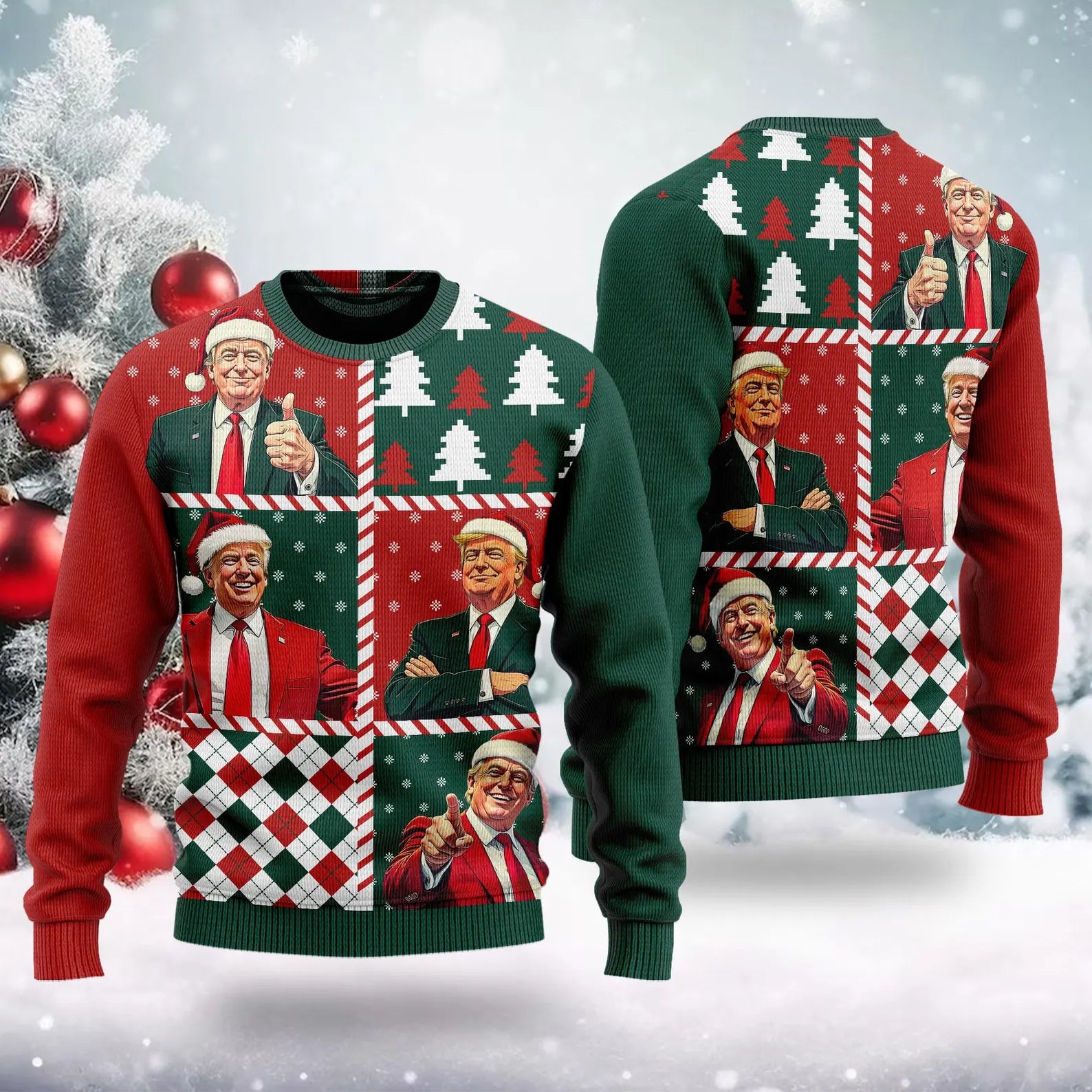 Stand out this holiday season with the Donald J. Trump "Make America Great Again" Christmas sweater! Featuring a bold collage design and festive accents, this unique sweater is perfect for holiday parties, ugly sweater contests, or as a fun gift for political enthusiasts. Made from premium knit fabric, it’s a comfortable and stylish option for both men and women.