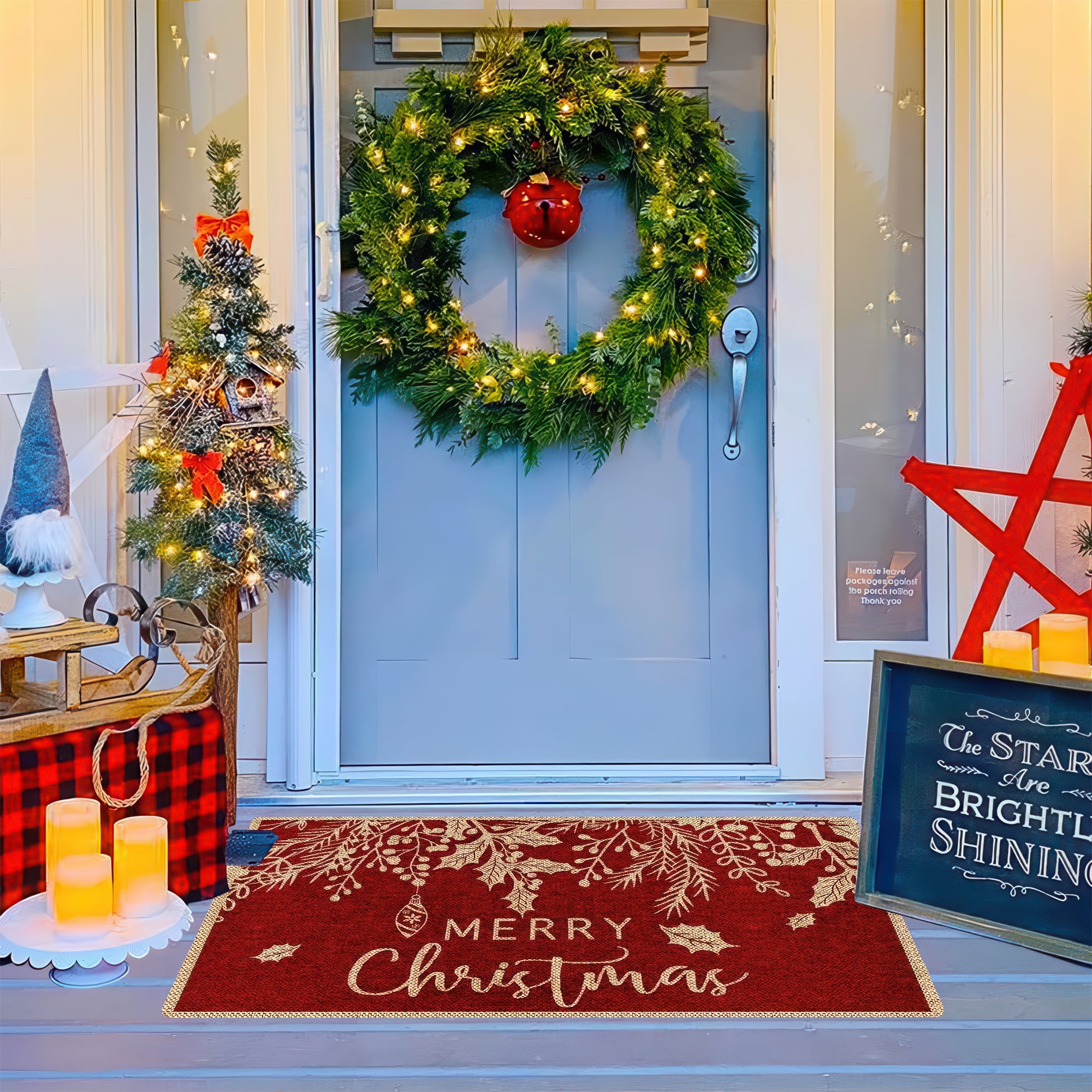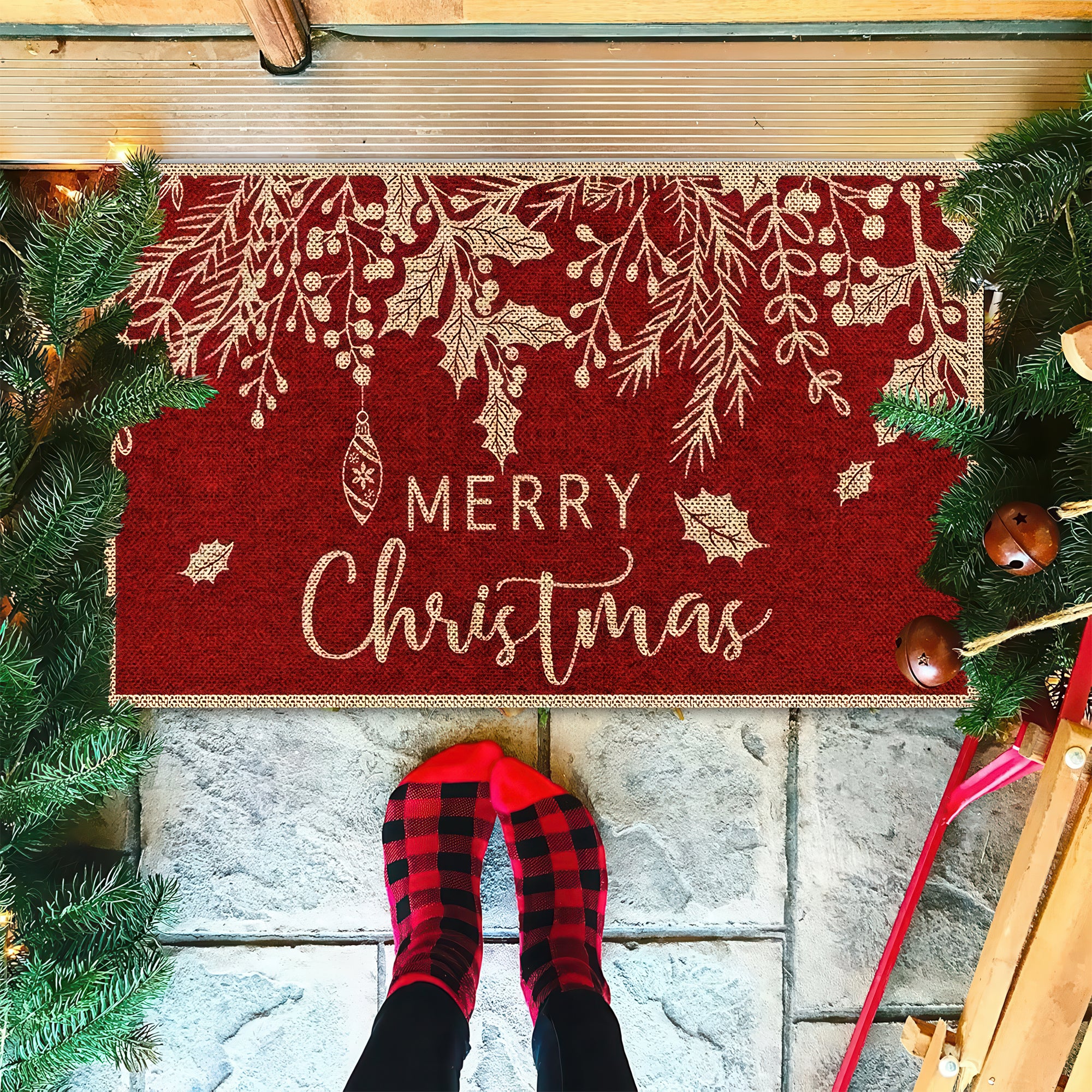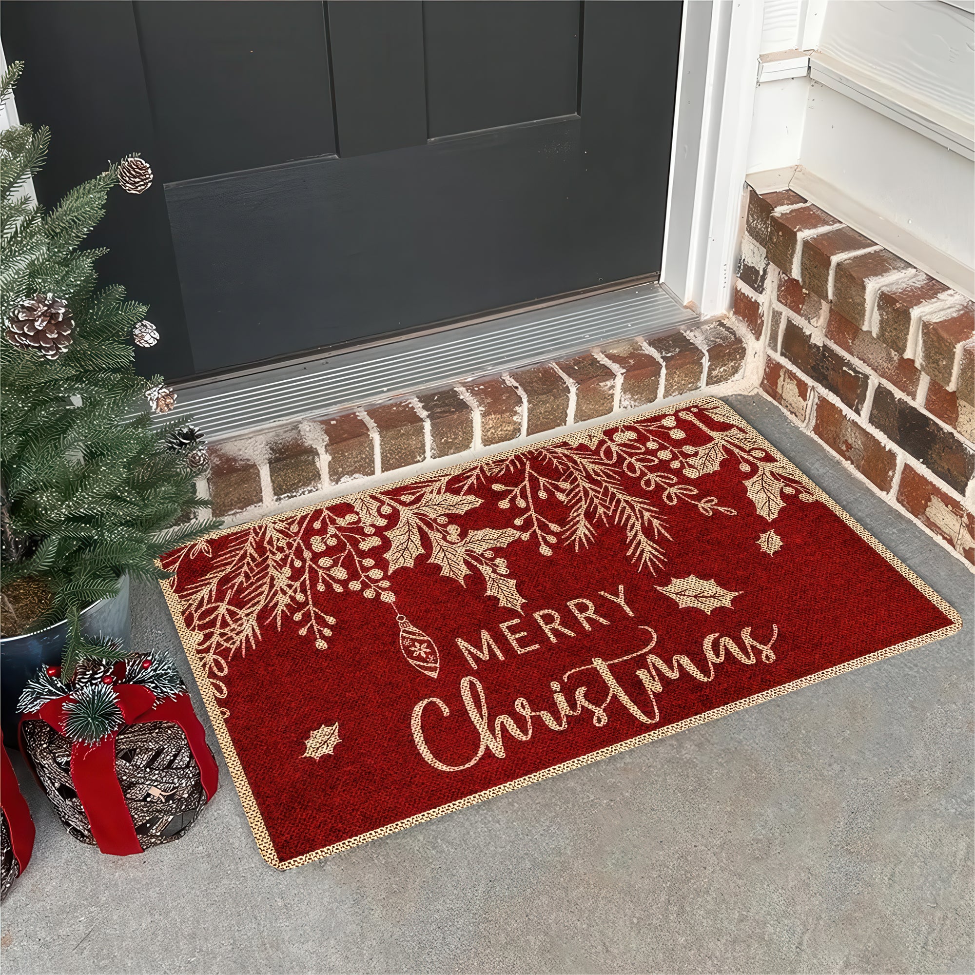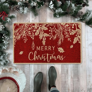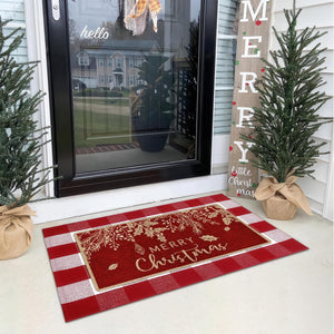 Merry Christmas Door Mat, Red and Gold Holiday Welcome Mat for Front Door