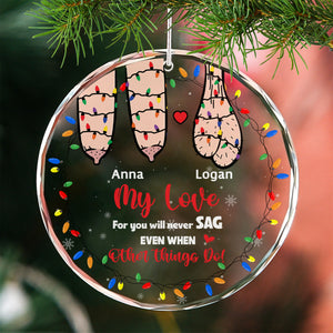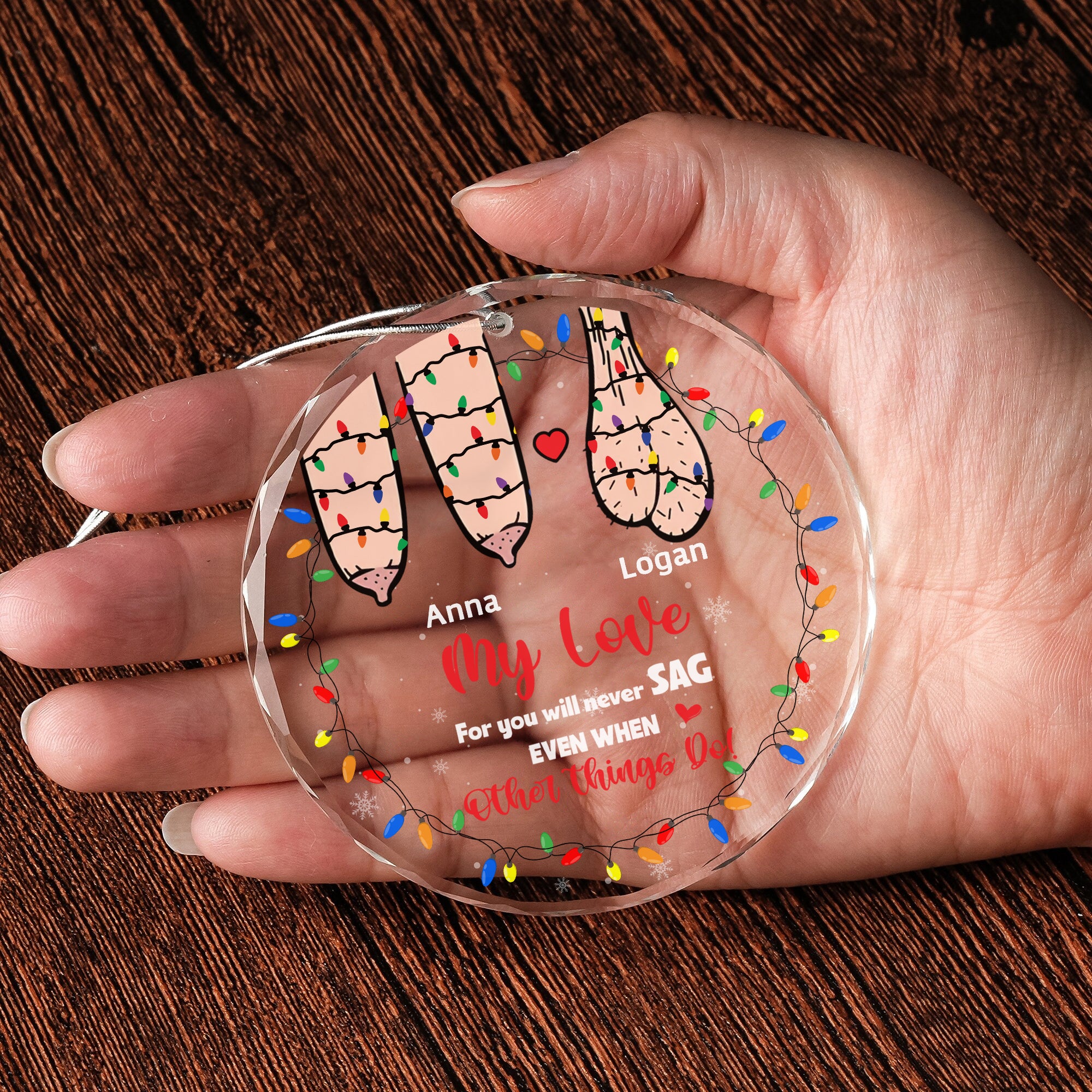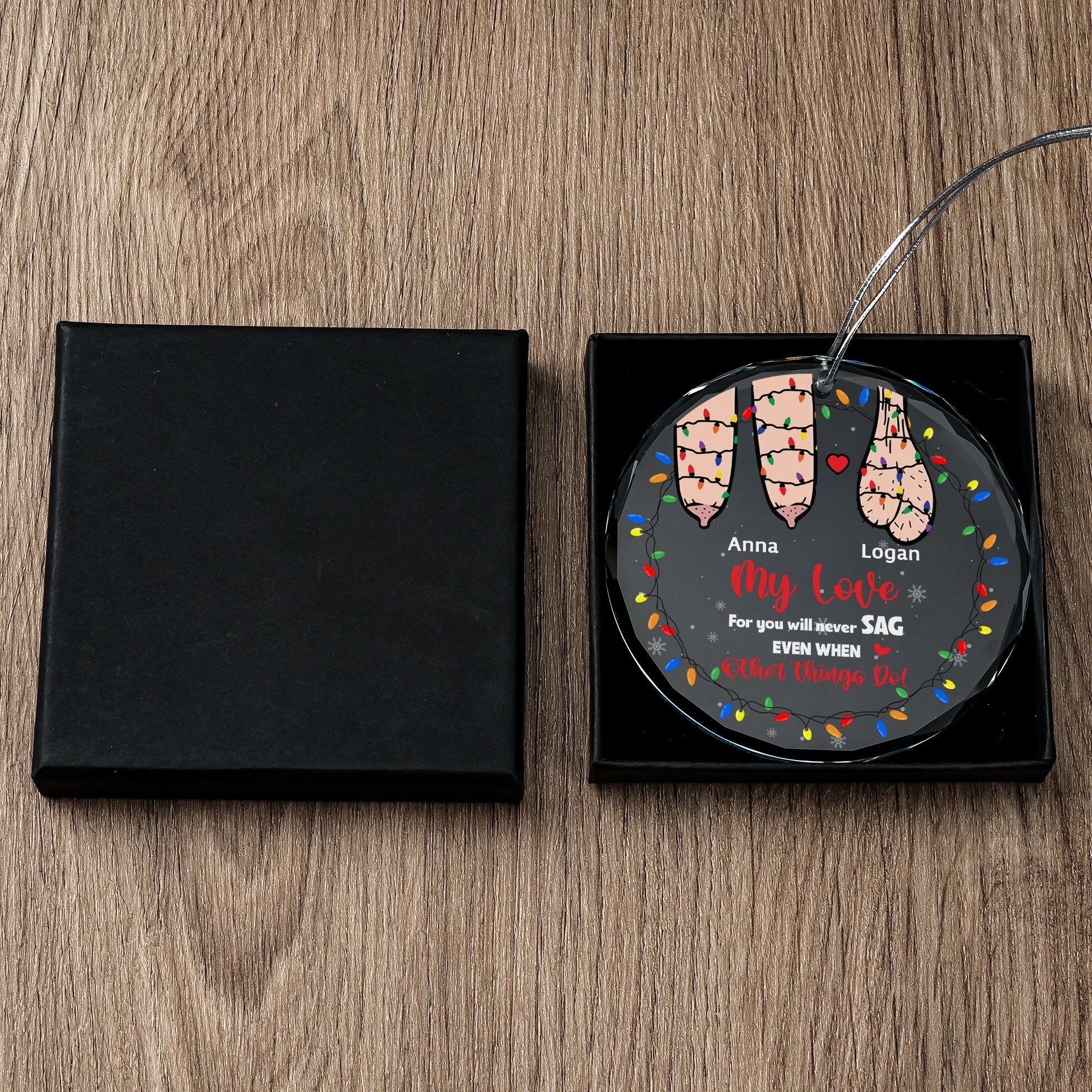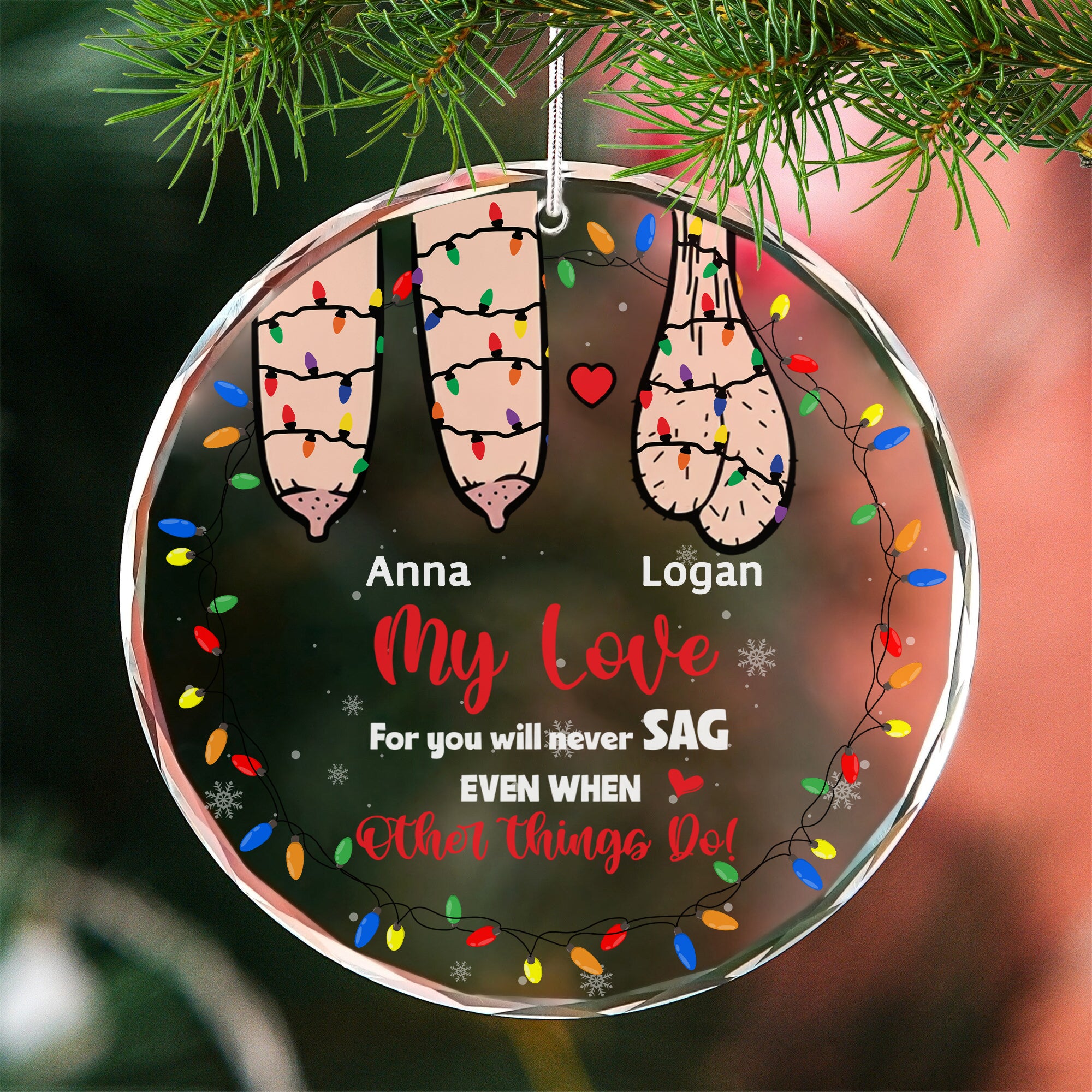 Crafted from high-quality glass, this ornament is beautifully detailed and can be customized with both of your names to make it a truly special keepsake. The fun and cheeky sentiment "My Love For You Will Never Sag Even When Other Things Do" adds a humorous touch to your Christmas tree decor while reminding you of the love and joy you share.