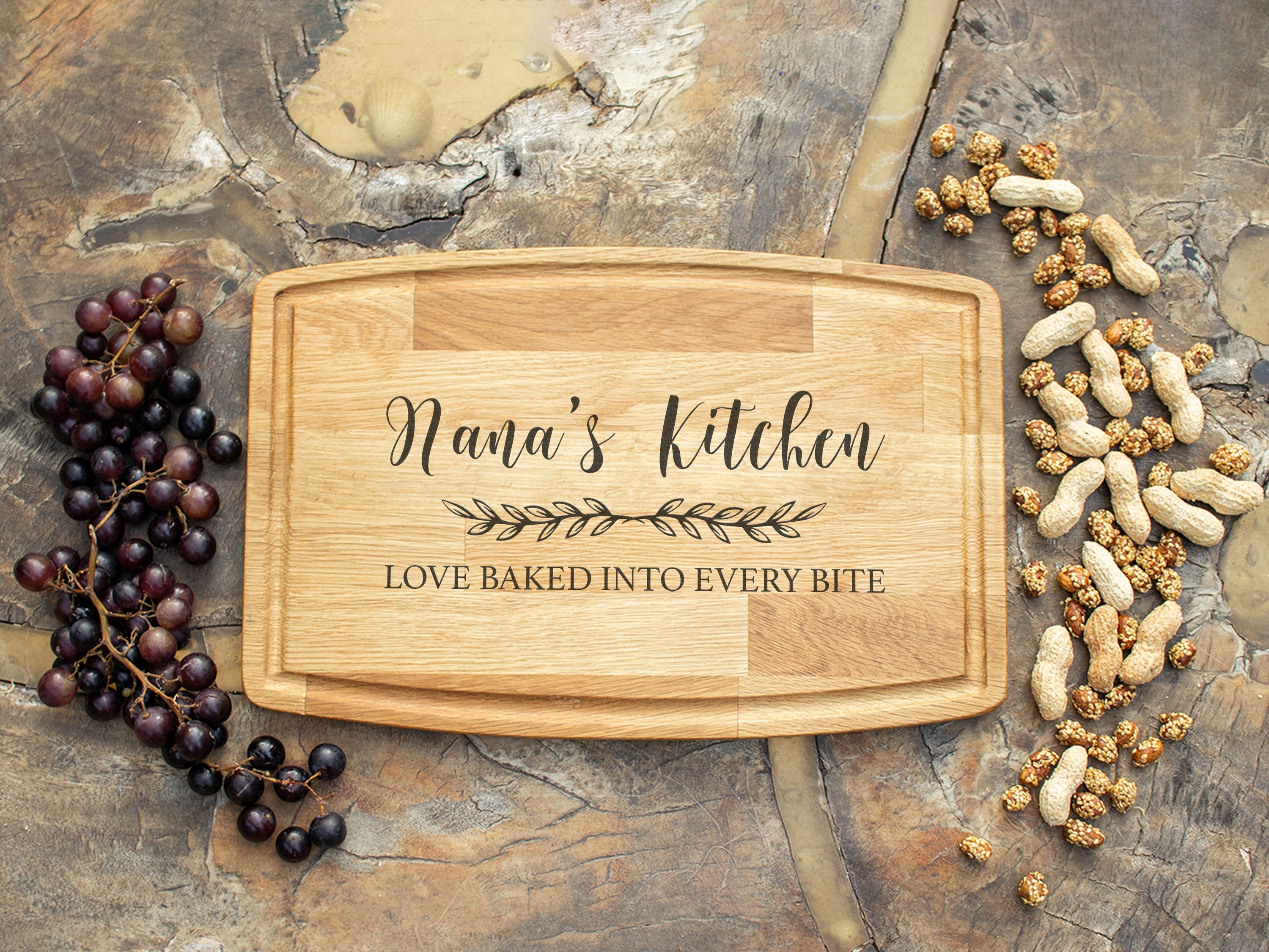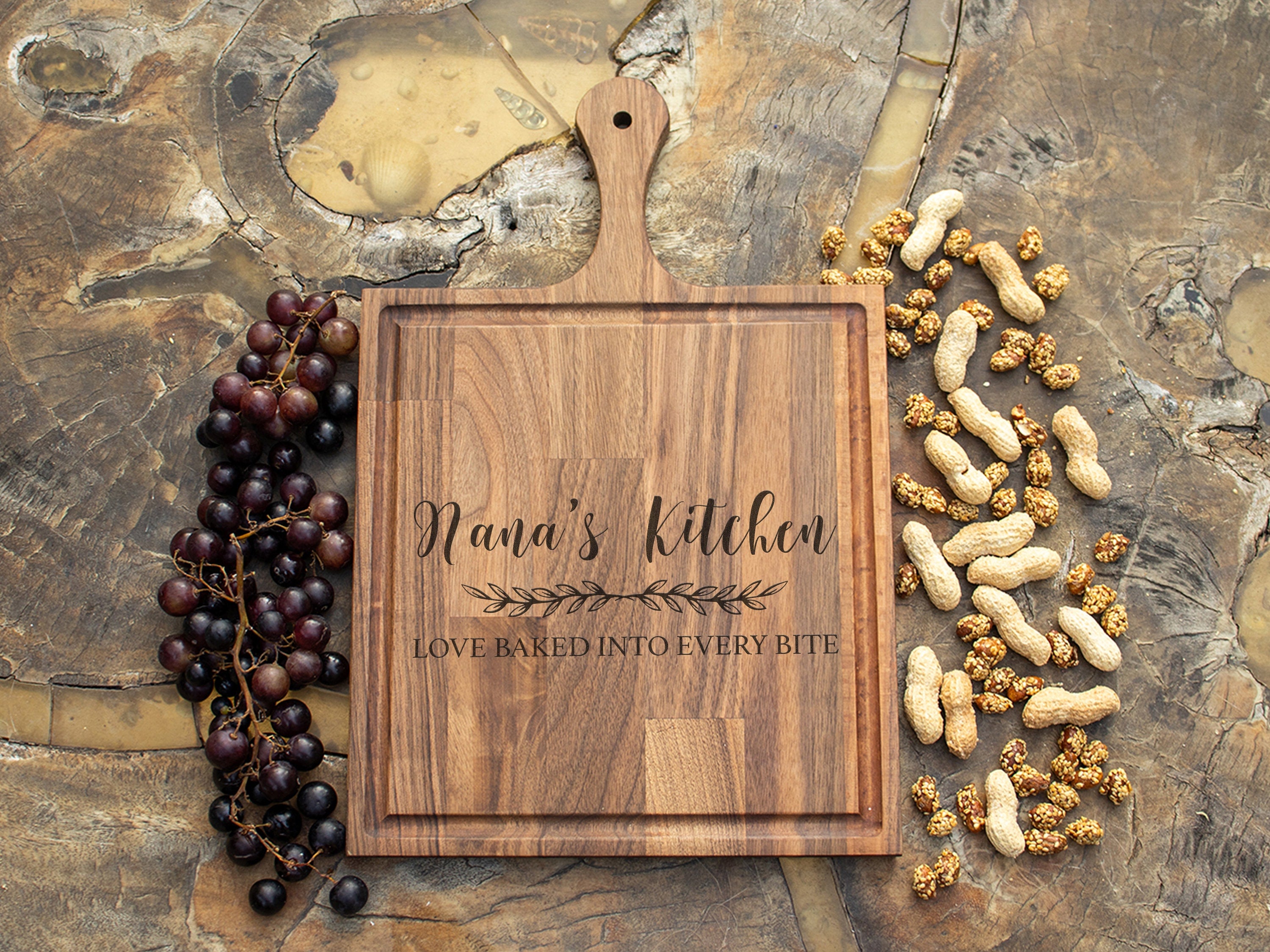 Customize this cutting board with the name or title of your choice (e.g., "Nana's Kitchen," "Mom's Kitchen"), creating a unique and meaningful gift. The engraving can also include special designs like floral accents, hearts, or a meaningful message to make it even more personal. -
