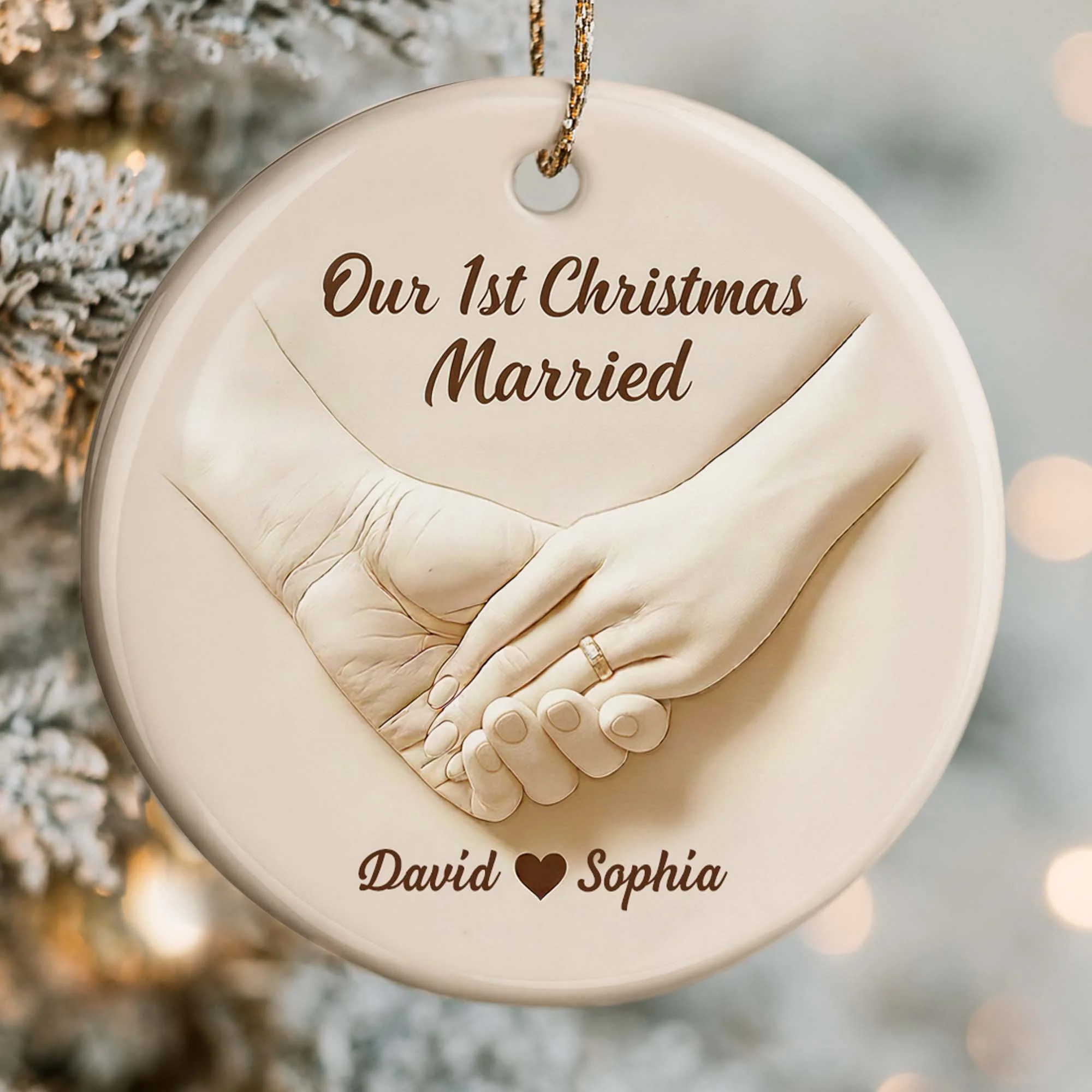 Our 1st Christmas Engaged Hands With Ring Custom Ceramic Ornament, Gift For Engaged Couples