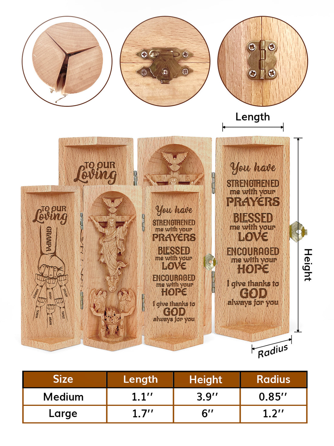 This intricately crafted wooden sculpture is a heartfelt tribute to faith and family. The product features a beautifully designed cylindrical wooden container that opens to reveal a 3D depiction of Jesus Christ on the cross, surrounded by angels and a dove symbolizing the Holy Spirit.