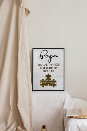 Introducing our heartfelt "PAPA You Are The Piece That Holds Us Together" Wooden Sign, a touching tribute to the pillar of your family and the glue that keeps everything together. This unique puzzle piece sign is not only a beautiful piece of decor but also a meaningful Father's Day gift that Dad will cherish forever.