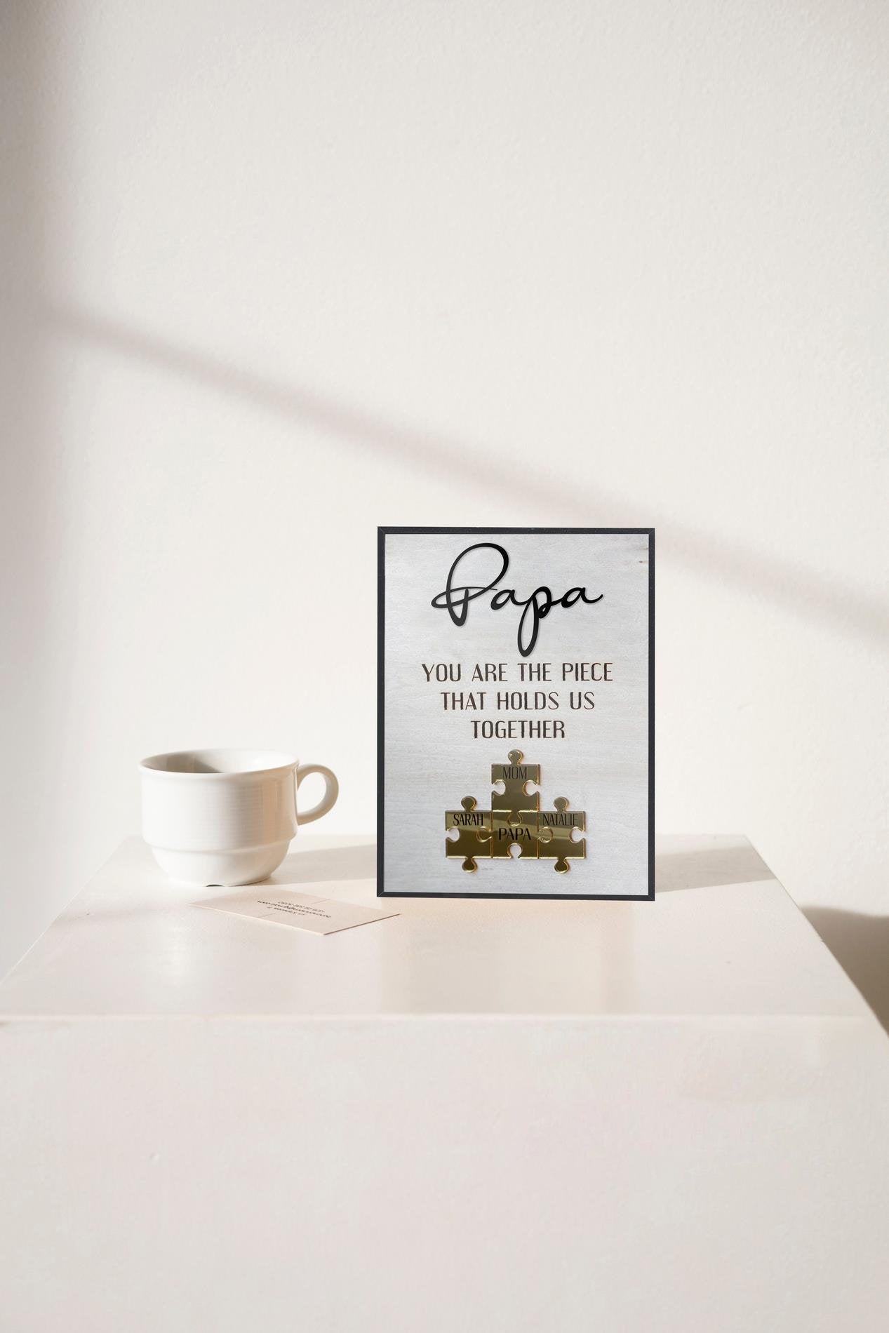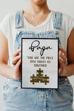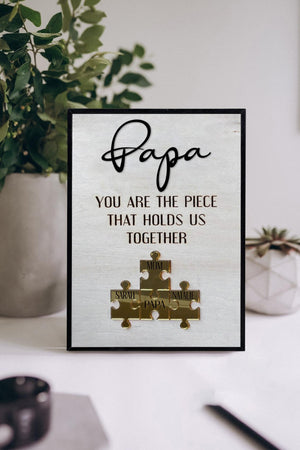 Crafted with care and attention to detail, this wooden sign features the endearing message "PAPA You Are The Piece That Holds Us Together." It's a daily reminder of the love and appreciation your family has for Dad's unwavering support and guidance.