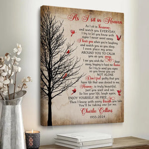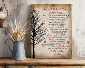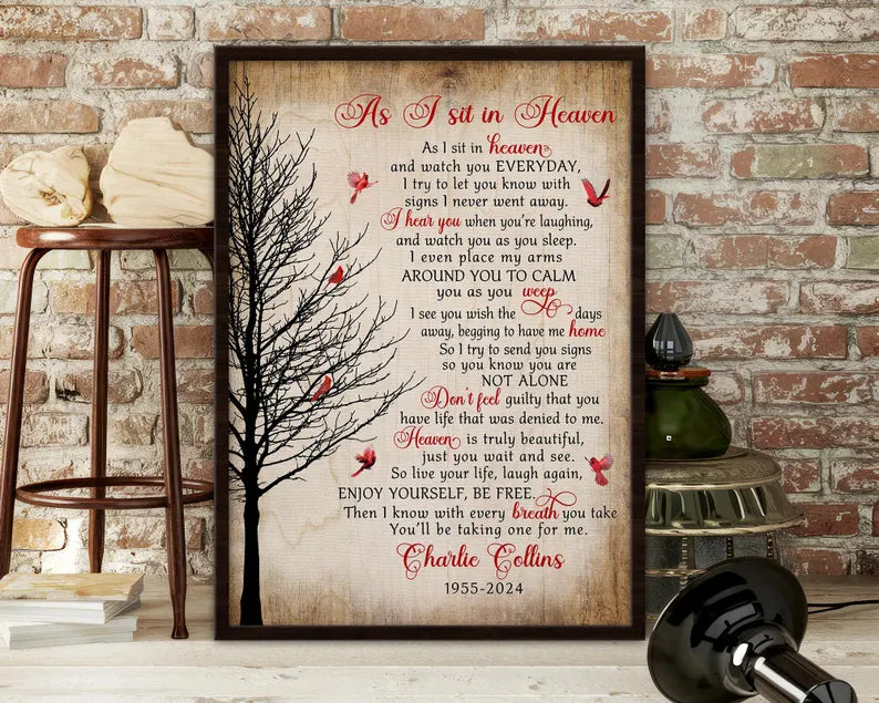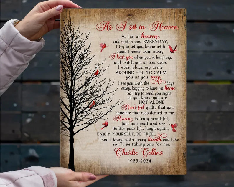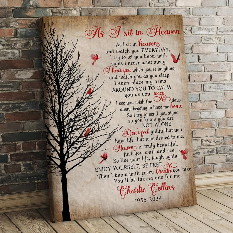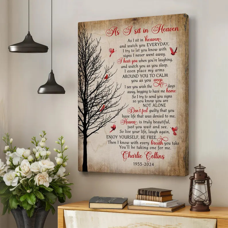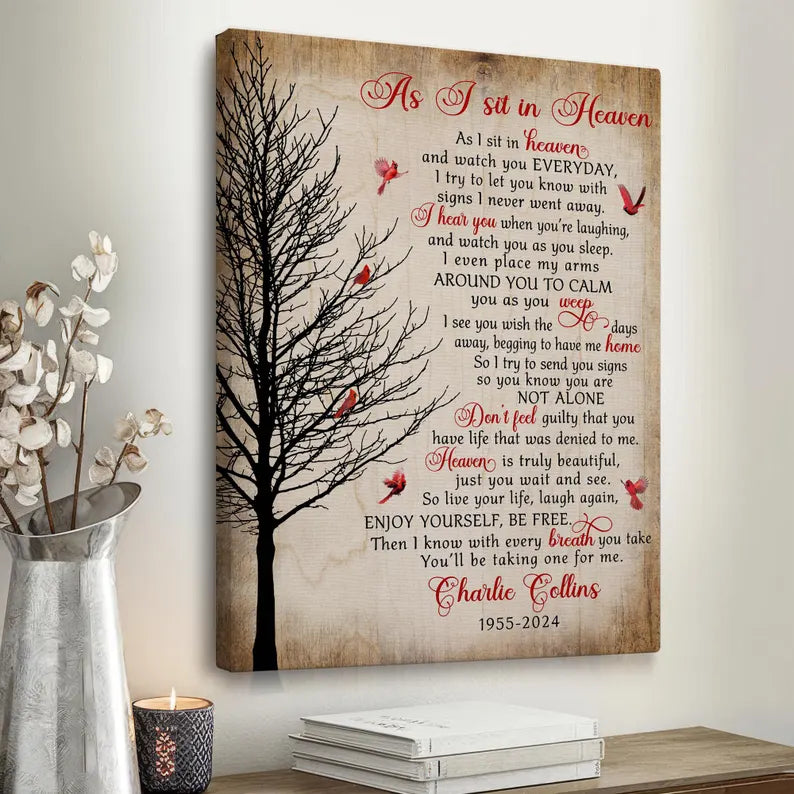 Honor the memory of a loved one with our heartfelt "As I Sit In Heaven" Memorial Canvas Print. This touching piece features a beautiful cardinal design, symbolizing the presence of those we have lost. Perfect for Christmas or any time of year, it serves as a comforting reminder that our loved ones are always with us.