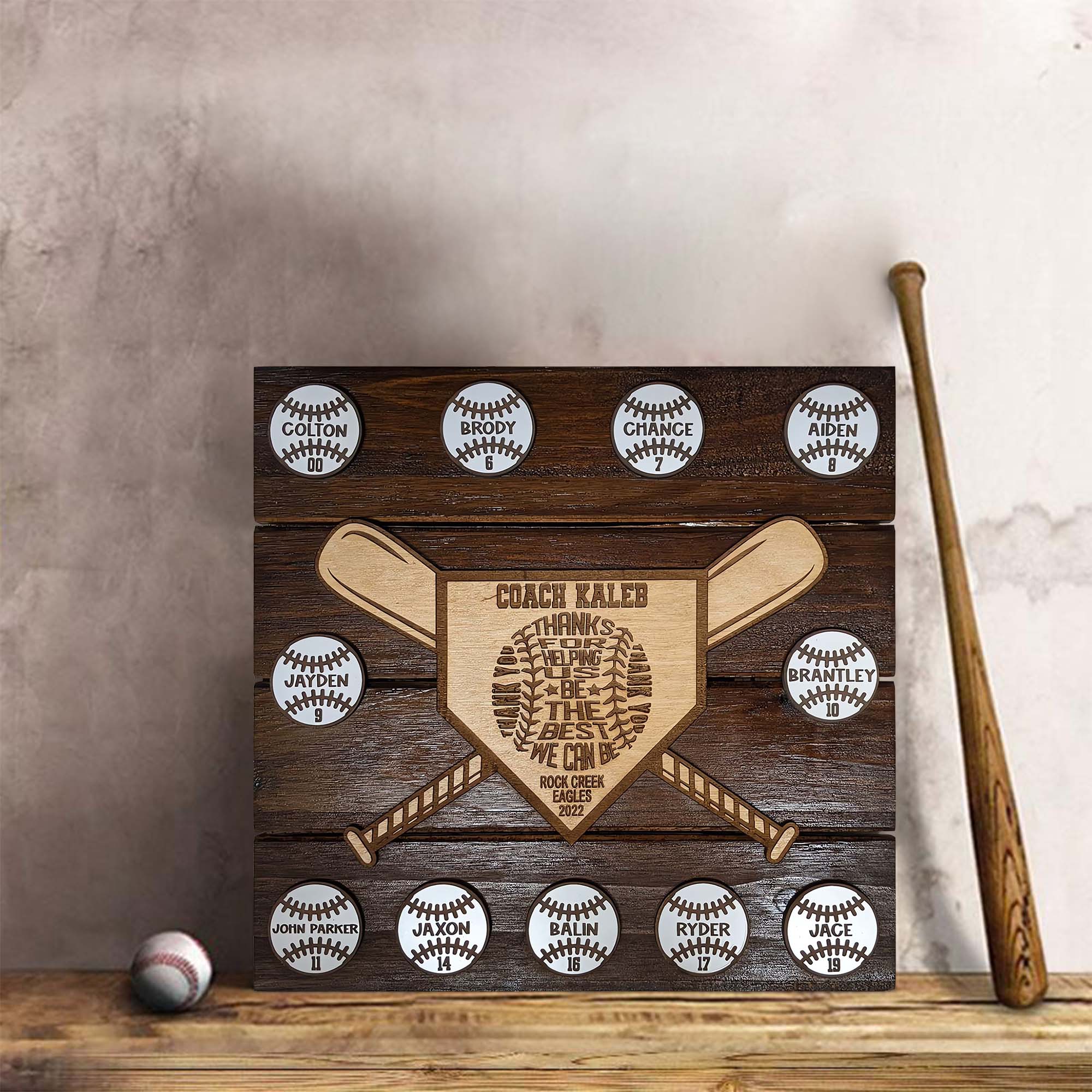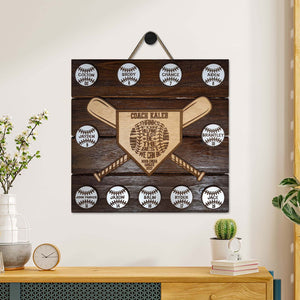 Show your appreciation to that special baseball or softball coach with our Personalized Wooden Coach Award. This custom-made award is a heartfelt way to say "Thank You" and recognize their dedication. The award features laser-cut decorative pieces mounted on a square wooden pallet-style plaque, with each baseball or softball bearing a player's name from your team. The home plate is engraved with the coach's name, team name, and season, making it a truly personal gift. The lightweight design allows for easy mounting on walls or doors, or it can be proudly displayed on a bookshelf.