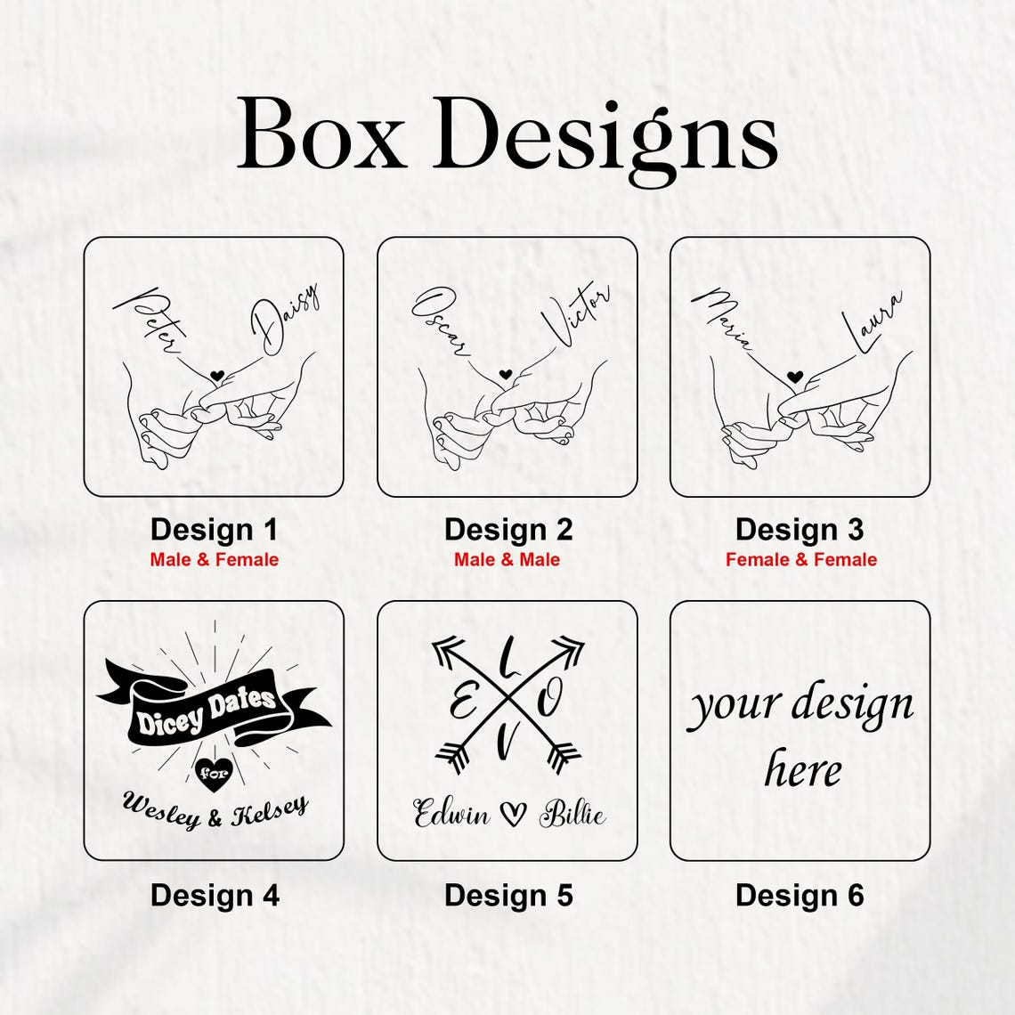 Spice up your date nights with the Personalized Date Night Dice! This fun and unique couple's game is designed to add excitement and creativity to your time together. Perfect for Valentine's Day, anniversaries, or just a fun way to break the routine, these position dice offer endless possibilities for playful intimacy and connection. The customizable dice allow you to personalize each side with activities, locations, or phrases that are meaningful to you as a couple, making it a truly unique experience every time.