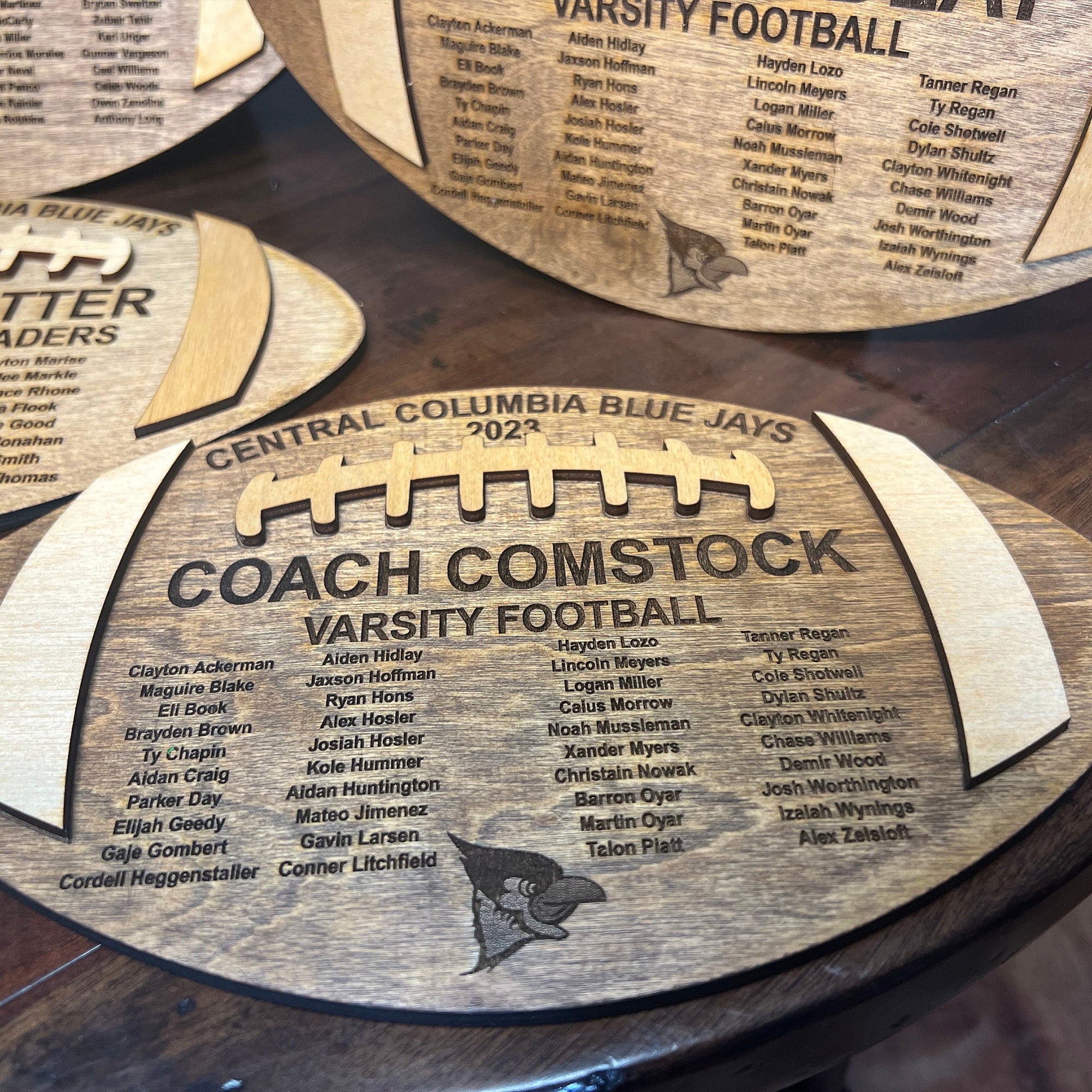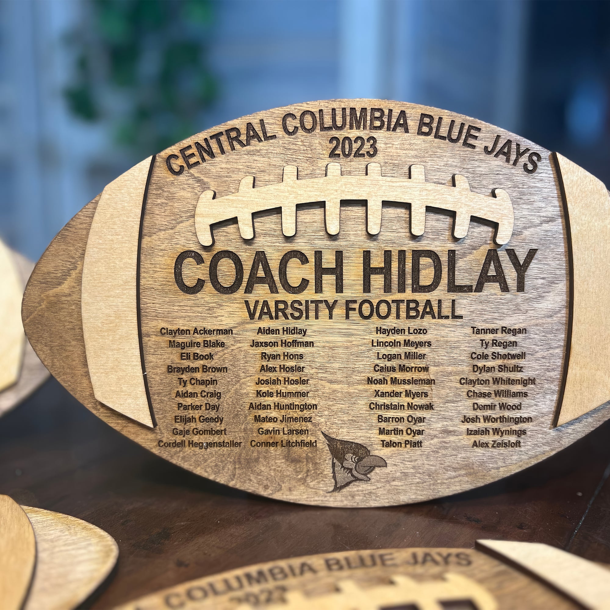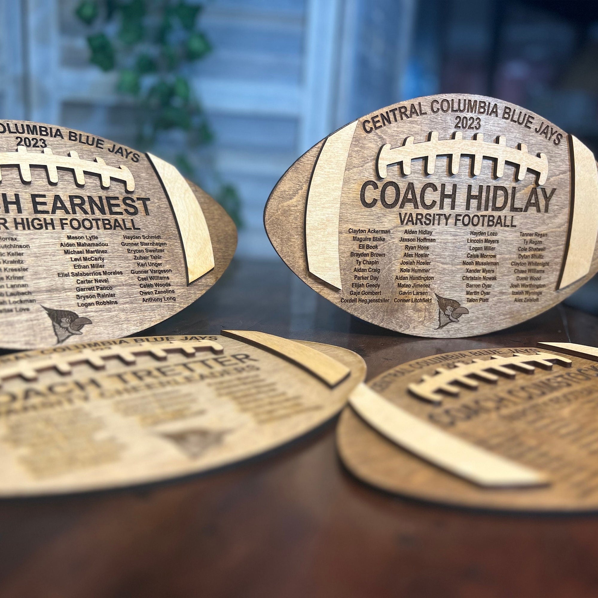 The design includes detailed football-themed elements making it a standout addition to any coach’s office, locker room, or home decor. -