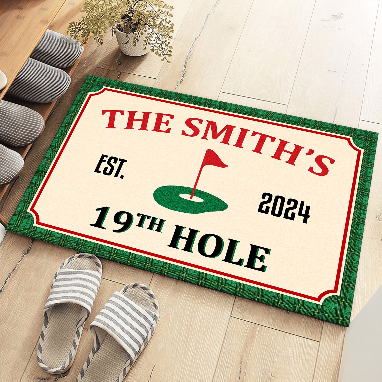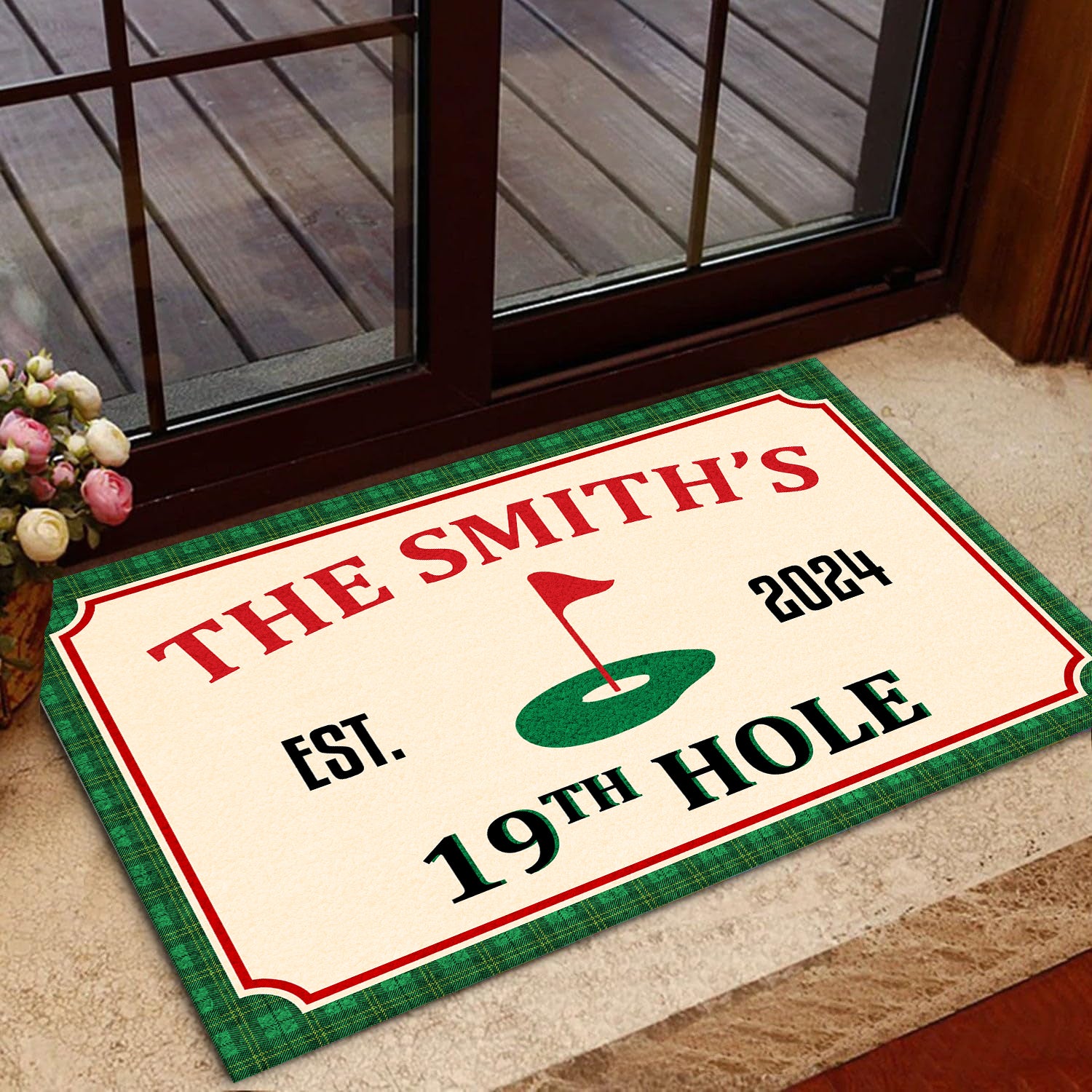 - The doormat features a golf-inspired design that includes elements such as a golf green, flagstick. At the center, it can be personalized with custom text, like the family name, making it truly unique.