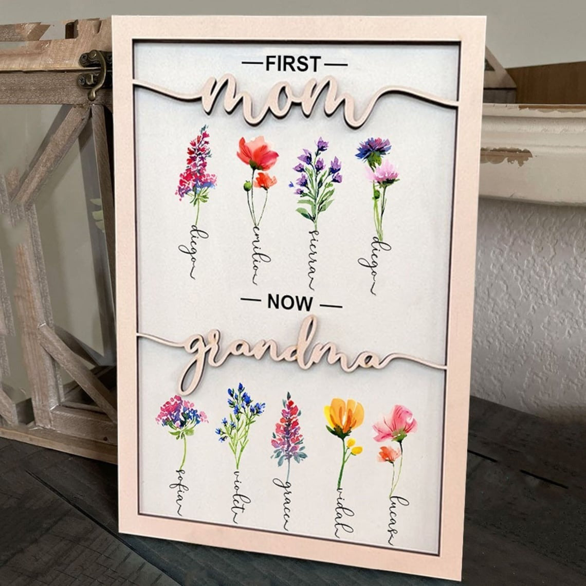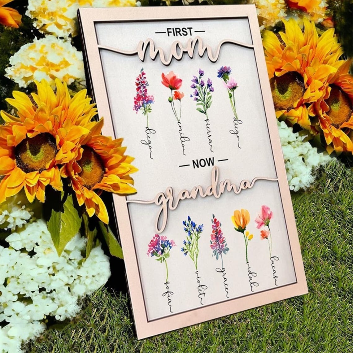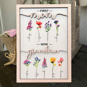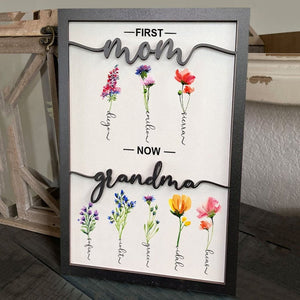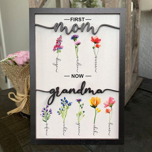 Personalized Grandma's Garden Birth Month Flower Frame Wood Sign, First Mom Now Grandma Sign, Present For Grandma With Grandchildren Names