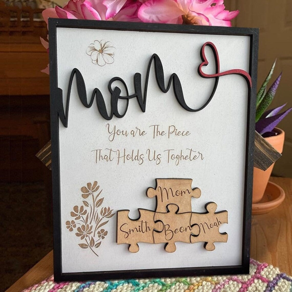 Personalized Mom Puzzle Wood Sign With Kids Name, Gifts For Mother's Day, You Are The Piece That Holds Us Together Home Wall Decor