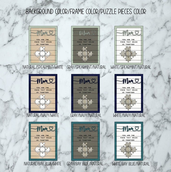 A beautiful personalized gift for the special lady in our live ~ Mom! This custom family puzzle sign features the phrase " Mom - you are the piece that holds us together". We can fit max 9 puzzle pieces in the size listed. Should you required larger number of puzzle pieces, please send me a message to discuss your requirement. This lovely Mother's Day gift idea can also read different names in lieu of Mom such as - Mama, Mommy, Momma, Amma, Ammi etc. Choose from contrasting stain colours to suit your home decor.