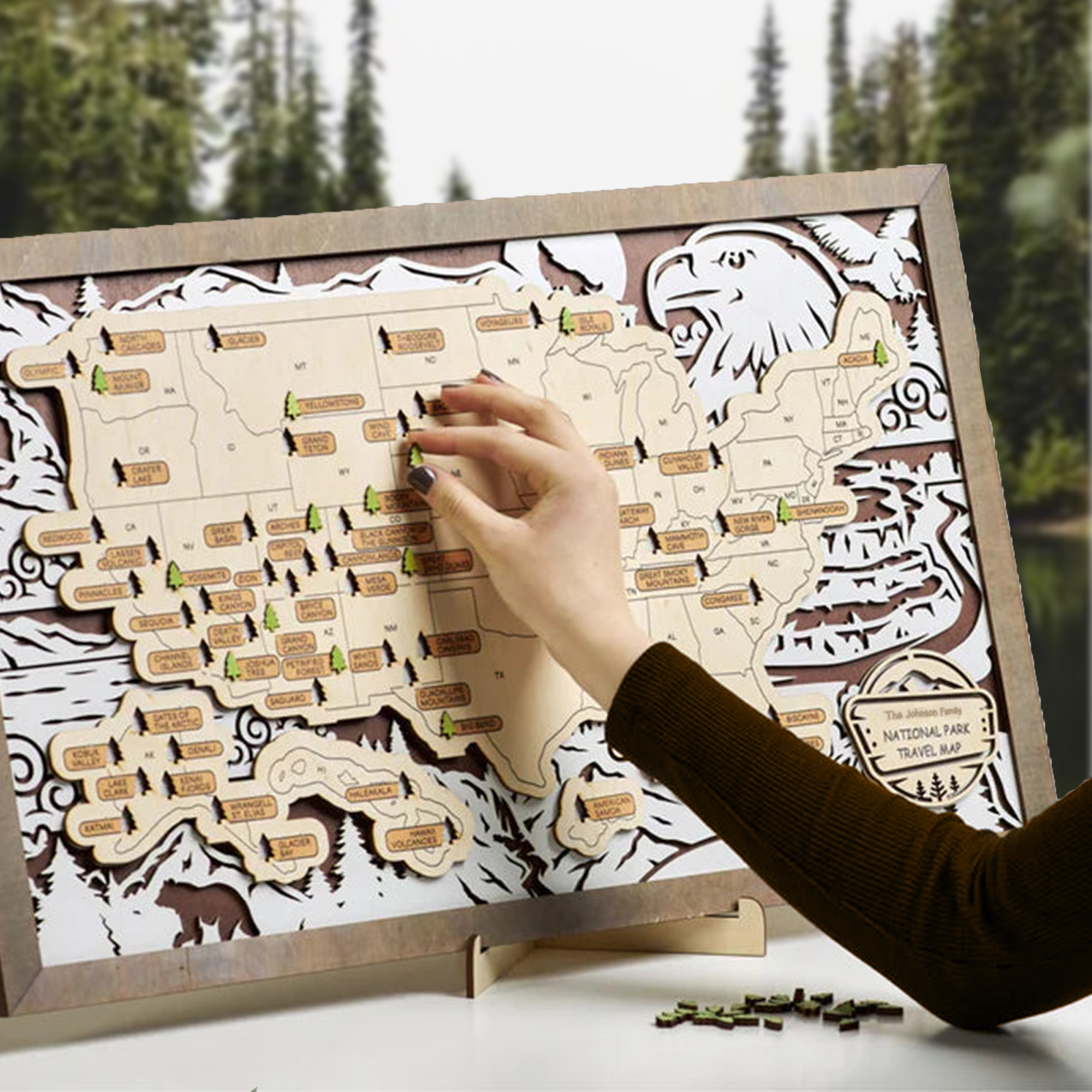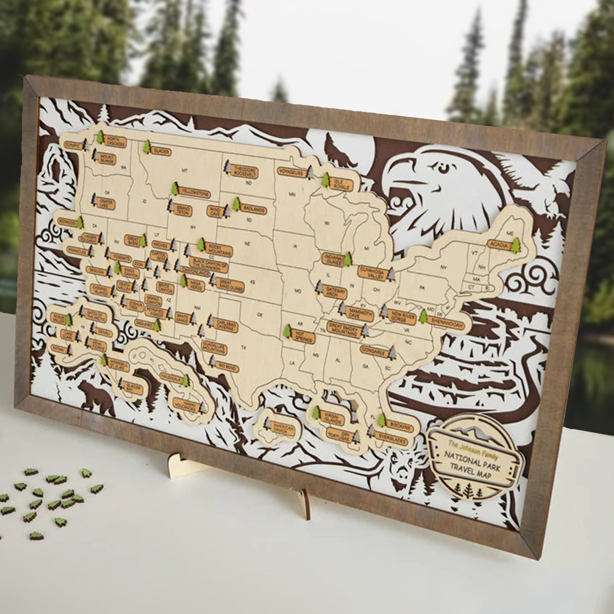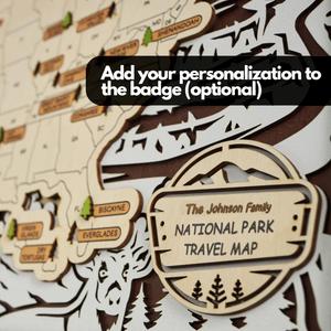 With our custom engraved badge, your wood map becomes a one-of-a-kind storyteller - marking your family name and the beginning of countless outdoor journeys through America's most beautiful parks.