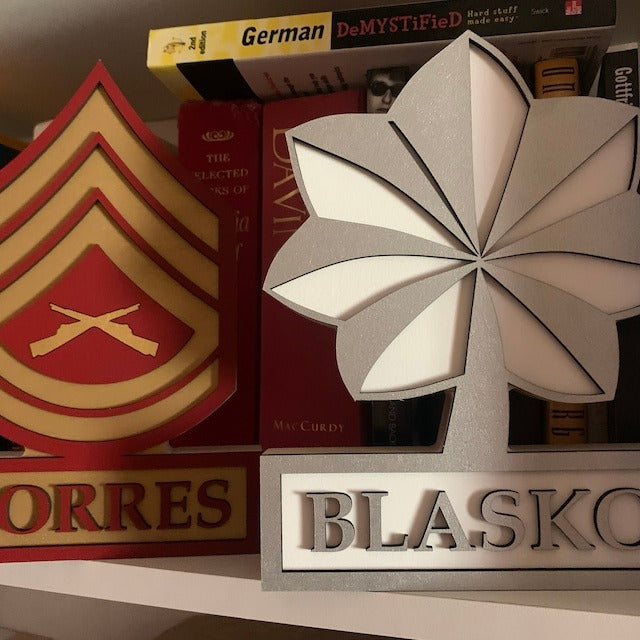Item varies in height based on the rank chosen. Bottom name piece is adjusted width wise to fit all letterings of the requested last name.