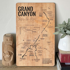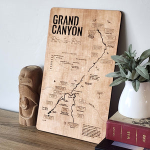 Bring the beauty of Arizona’s Grand Canyon’s Rim to Rim, or Rim to Rim to Rim (R2R2R) trail into your home with our stunning engraved wood sign. This dramatic trail map takes you through Earth’s history, passing by wildlife, through eleven layers of ancient rocks, before reaching the Colorado River. The trail provides an off-the-beaten-track experience that will leave you in awe of the stunning scenery. This tabletop decor, or wall art, makes a great gift for the guy or girl hiker in your life.