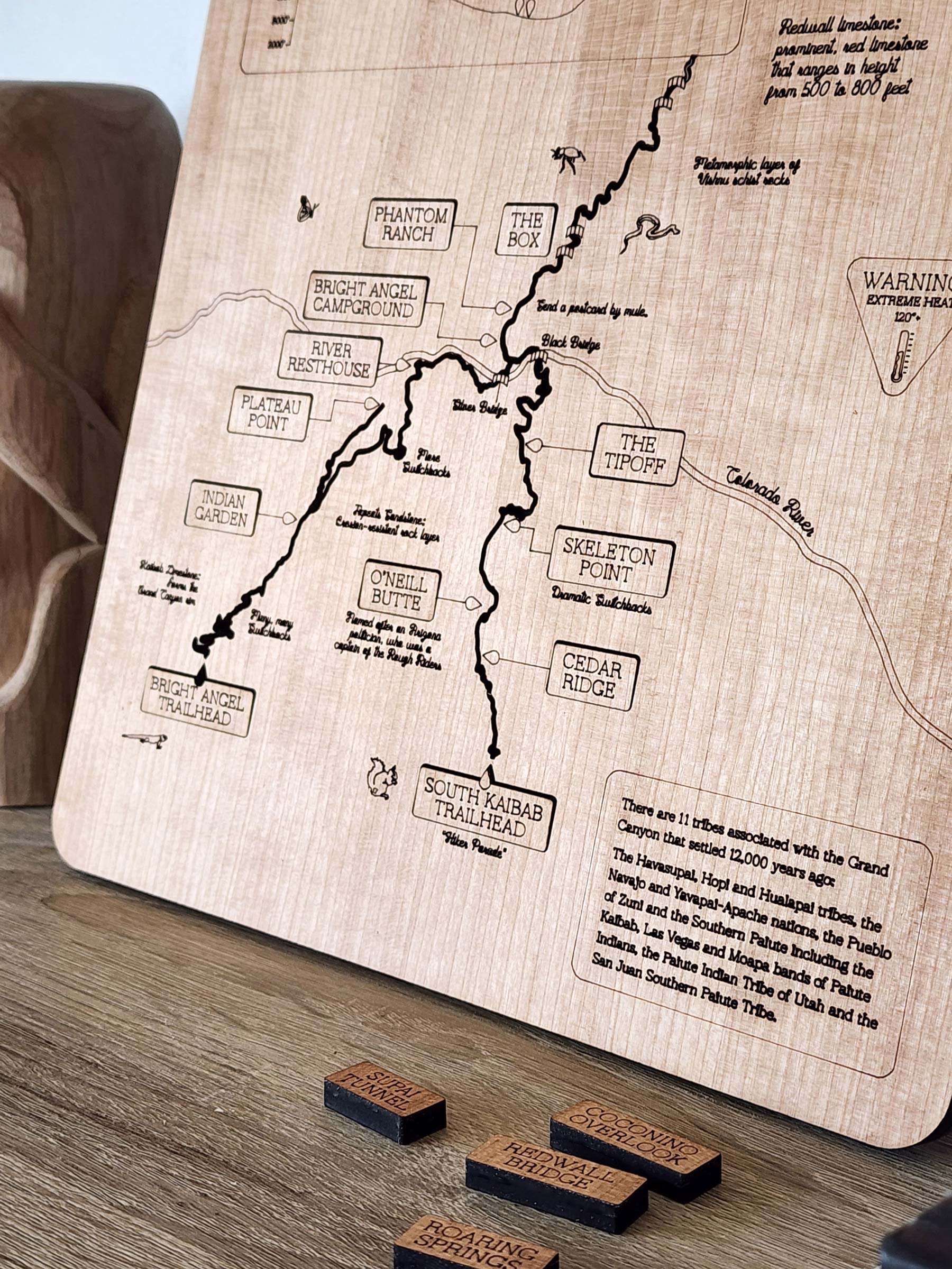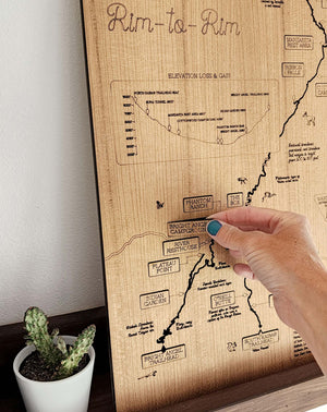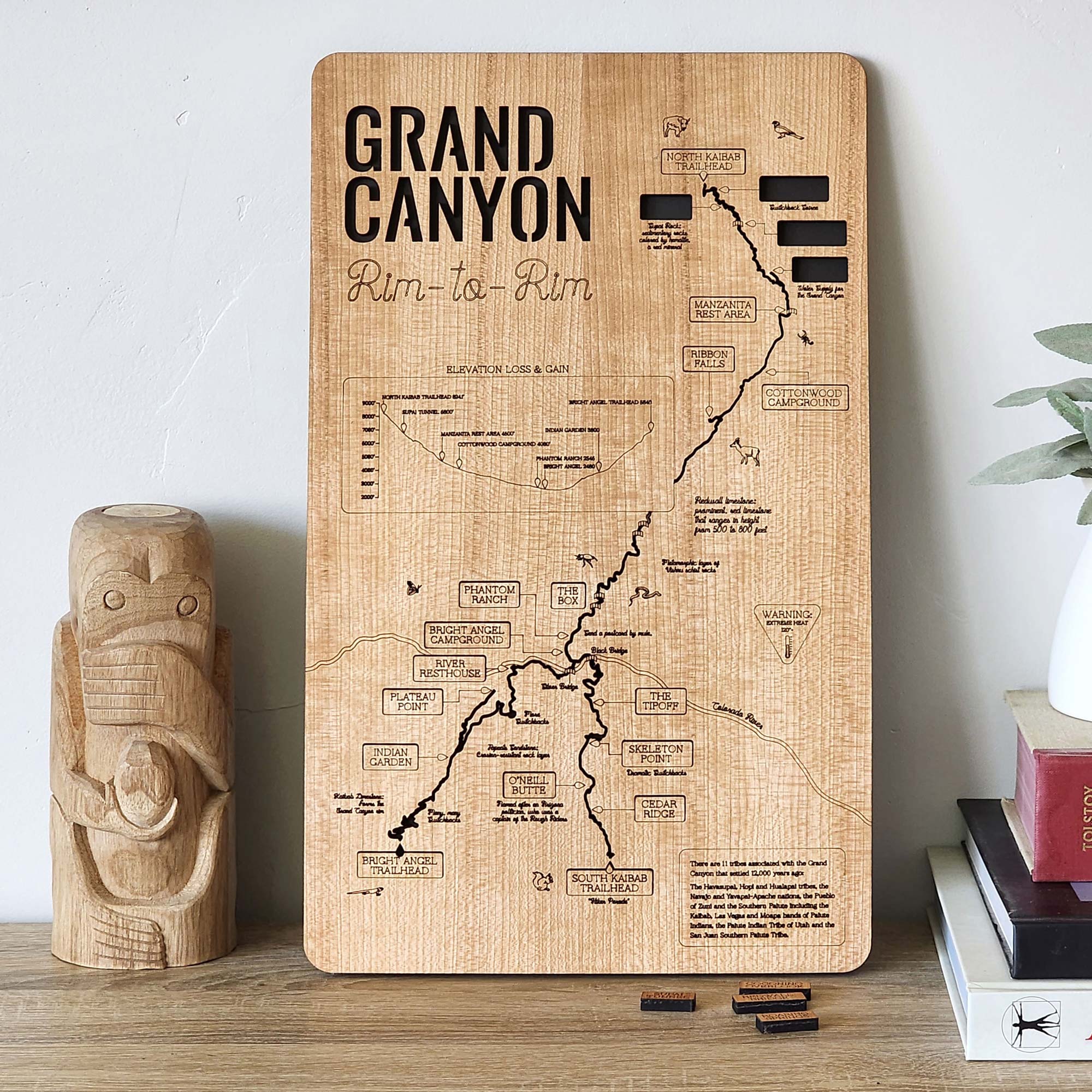 Hang this artistic tracker board on your wall or display it as coffee table art. It’s a great conversation piece and a great motivator for you to hike the Rim to Raim trail in the Grand Canyon.