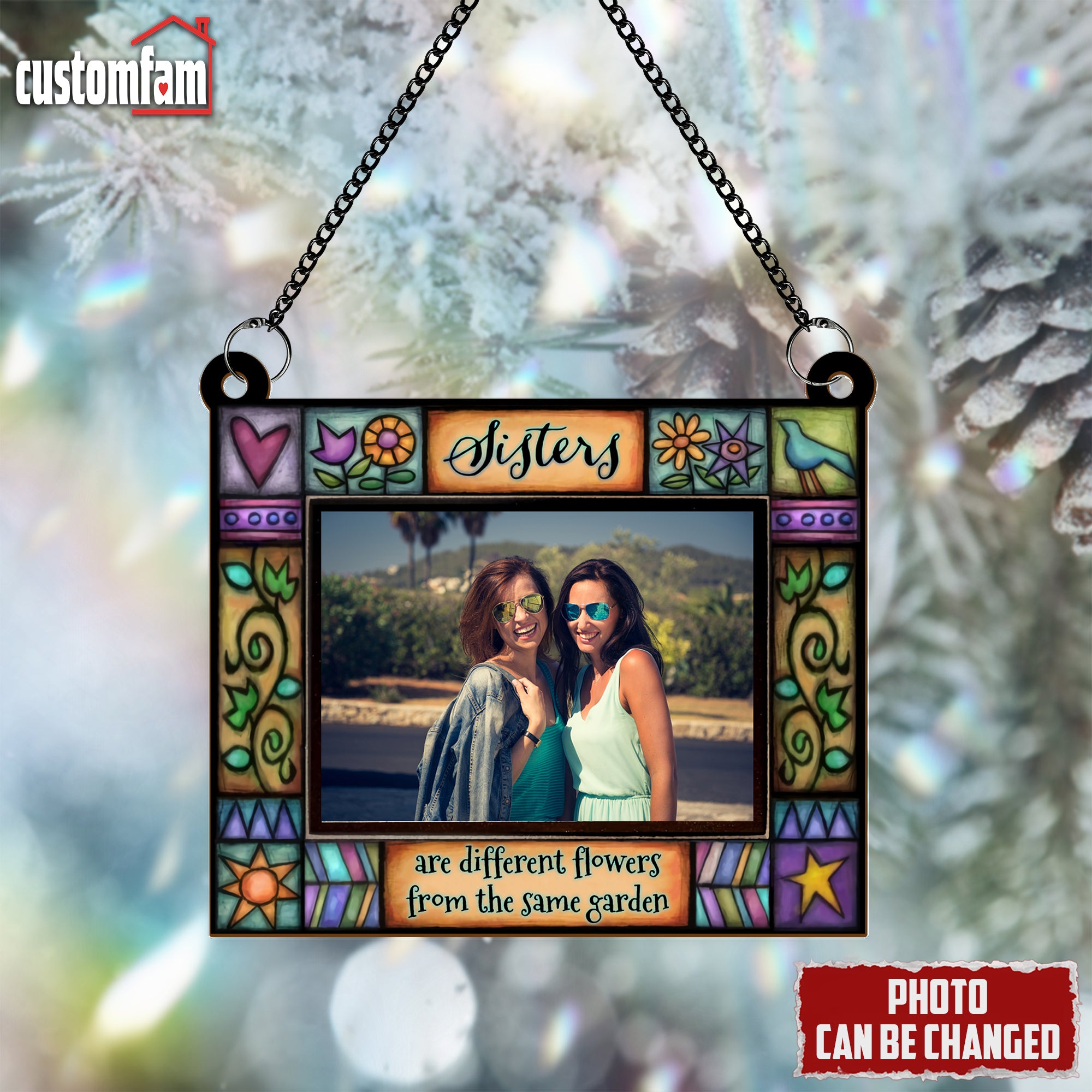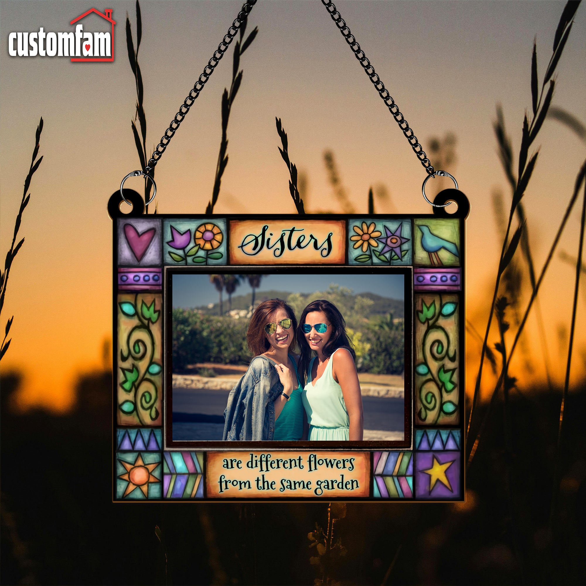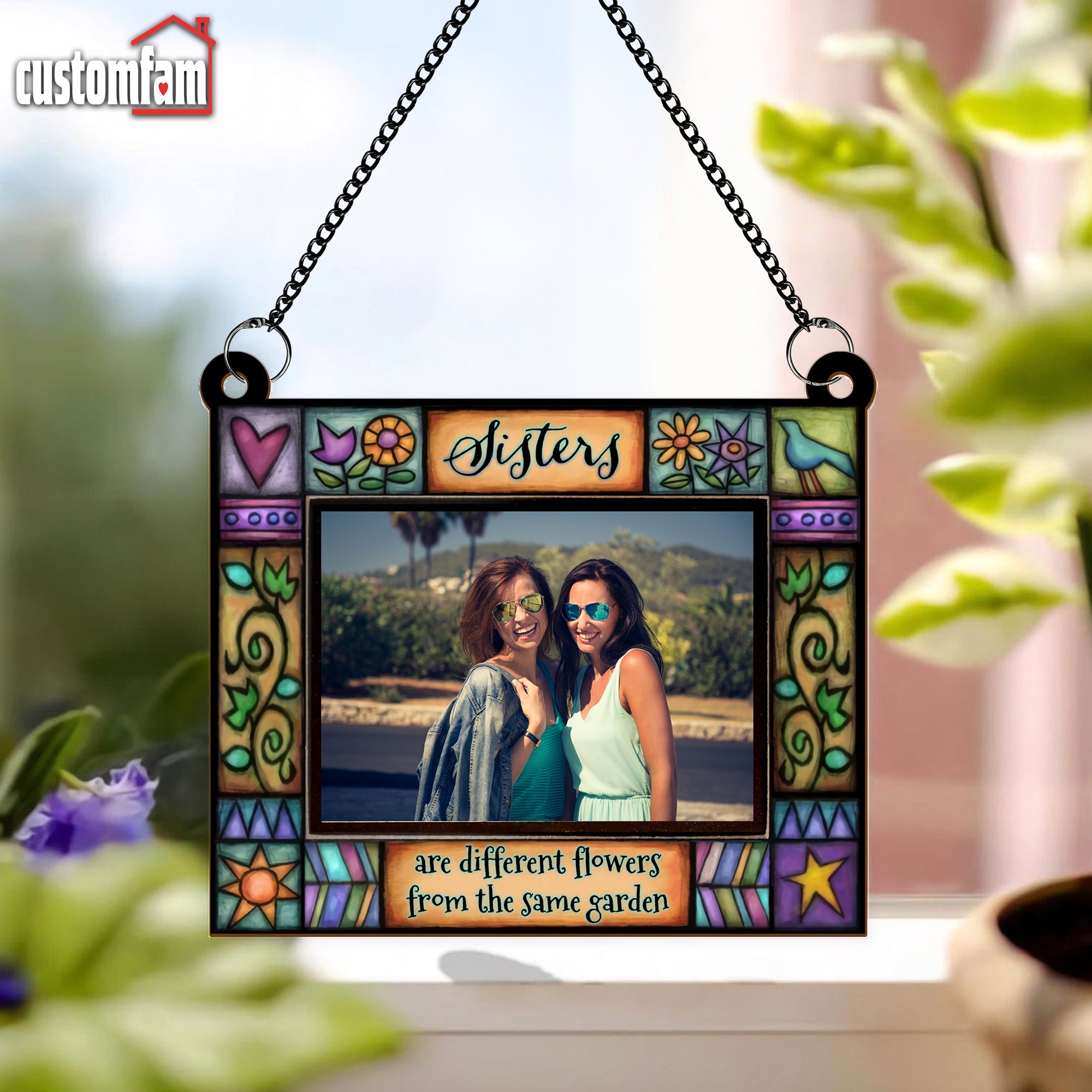 Featuring the heartwarming quote, “Sisters Are Different Flowers From The Same Garden” this custom suncatcher allows you to frame your favorite photo while reflecting light through its stained glass-inspired design.