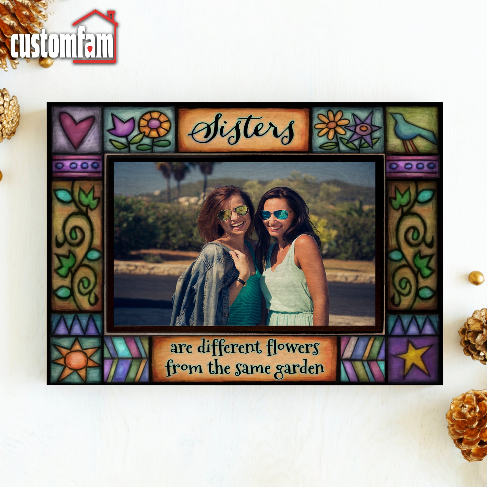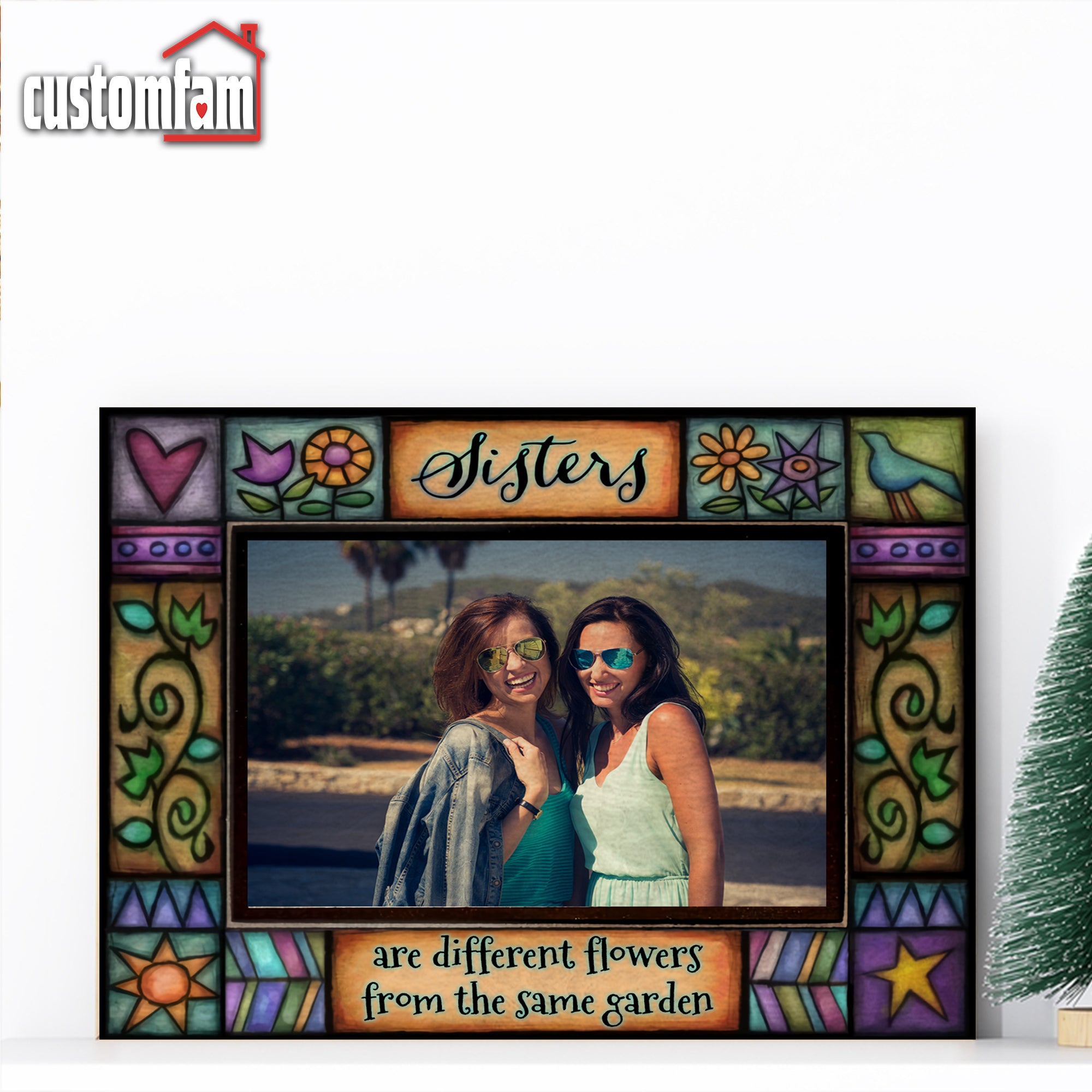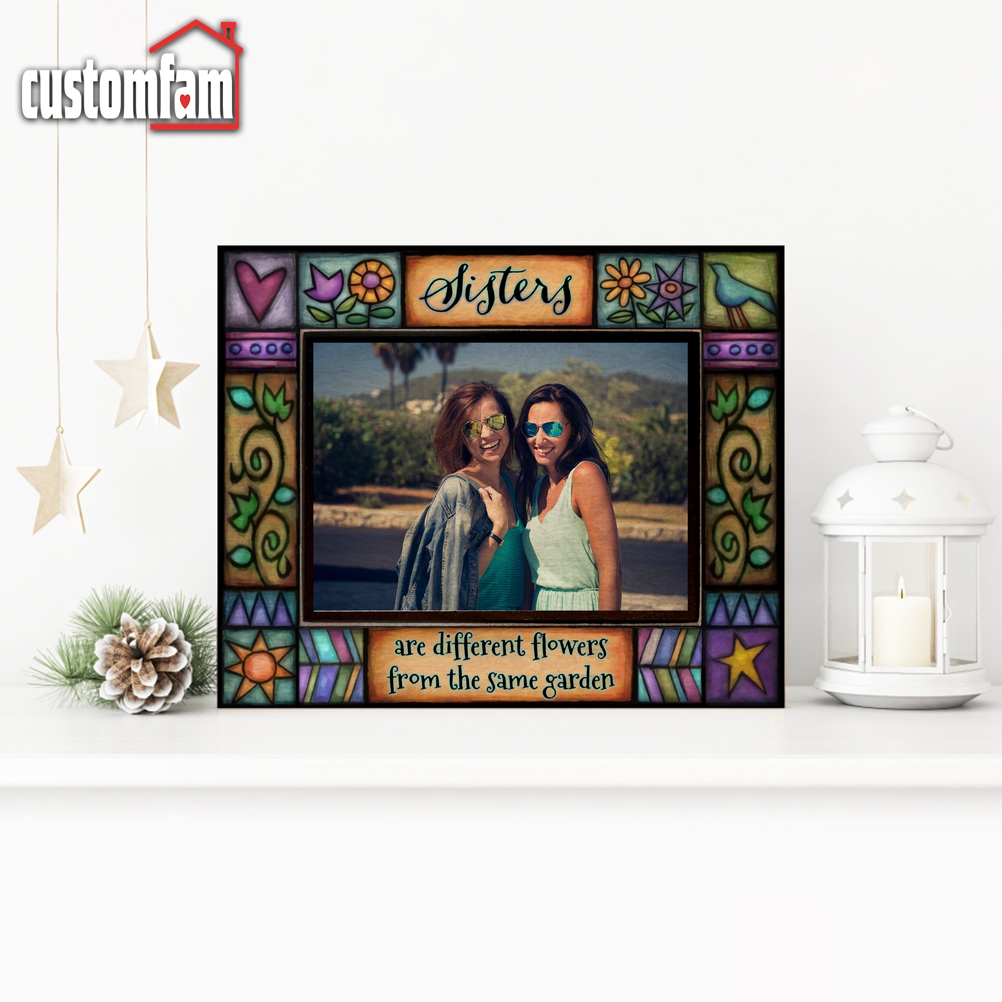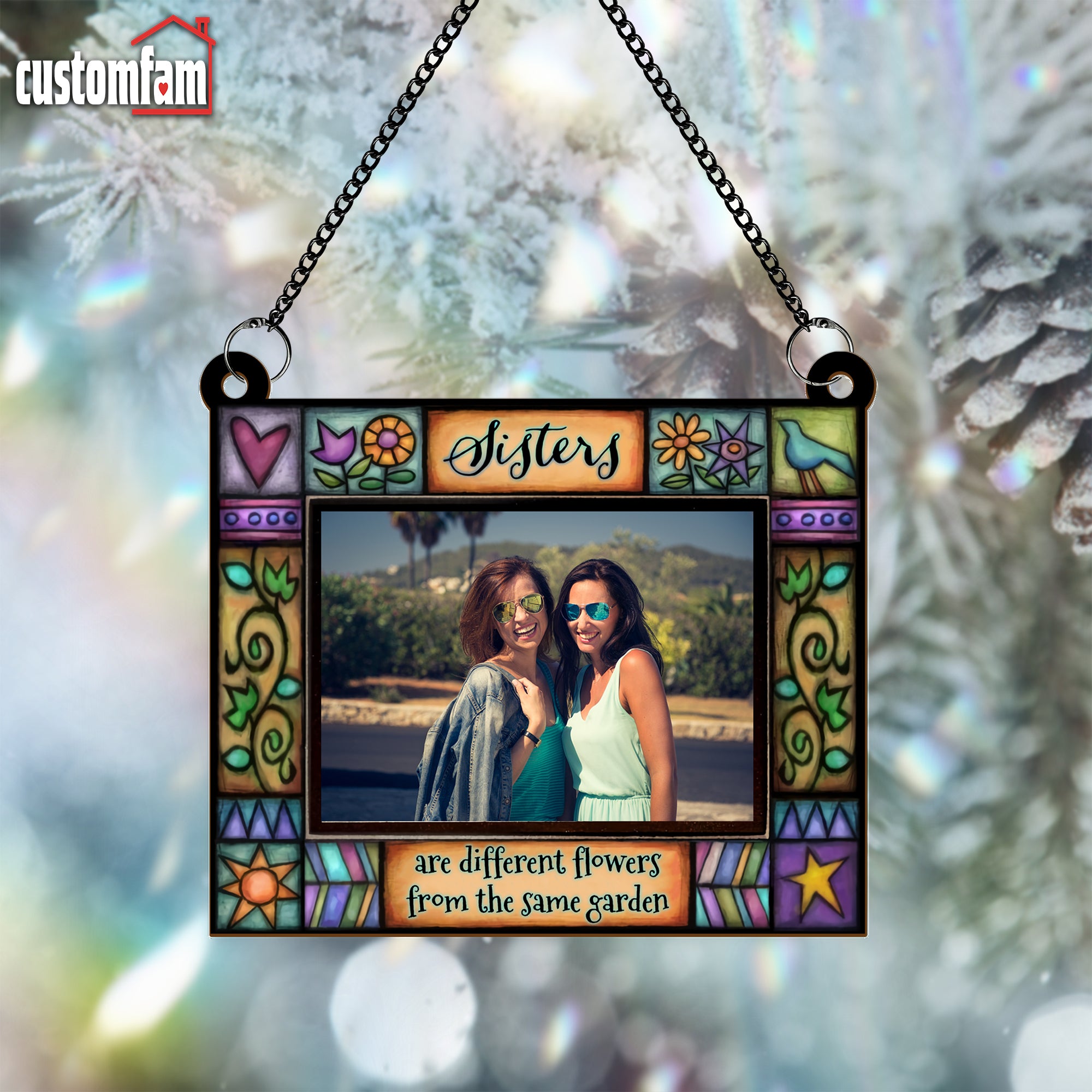 Featuring the heartwarming quote, “Sisters Are Different Flowers From The Same Garden” this custom suncatcher allows you to frame your favorite photo while reflecting light through its stained glass-inspired design.