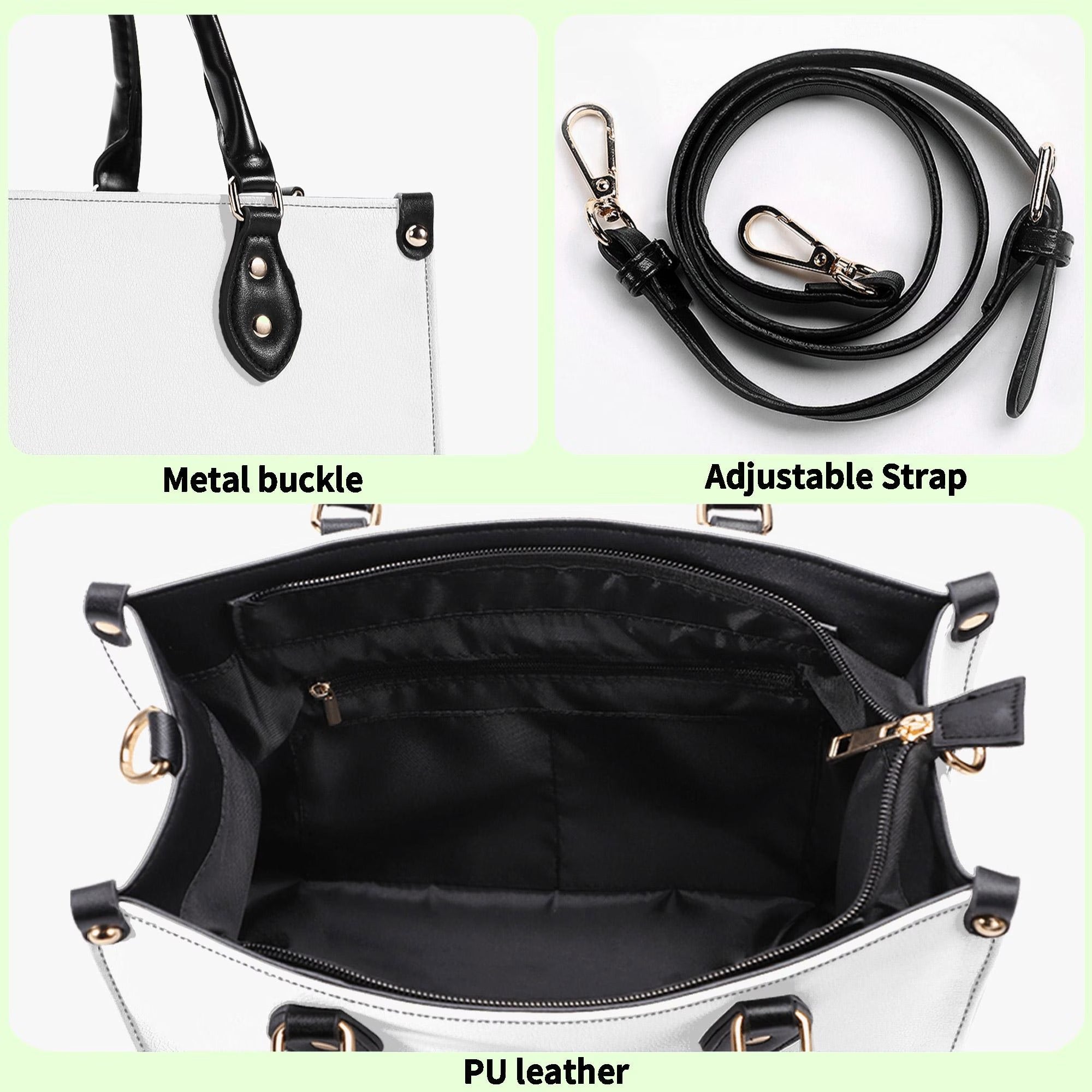 The bag features two handles, a detachable shoulder strap, and a zippered closure. It can be worn as a handbag, shoulder bag, or crossbody bag.