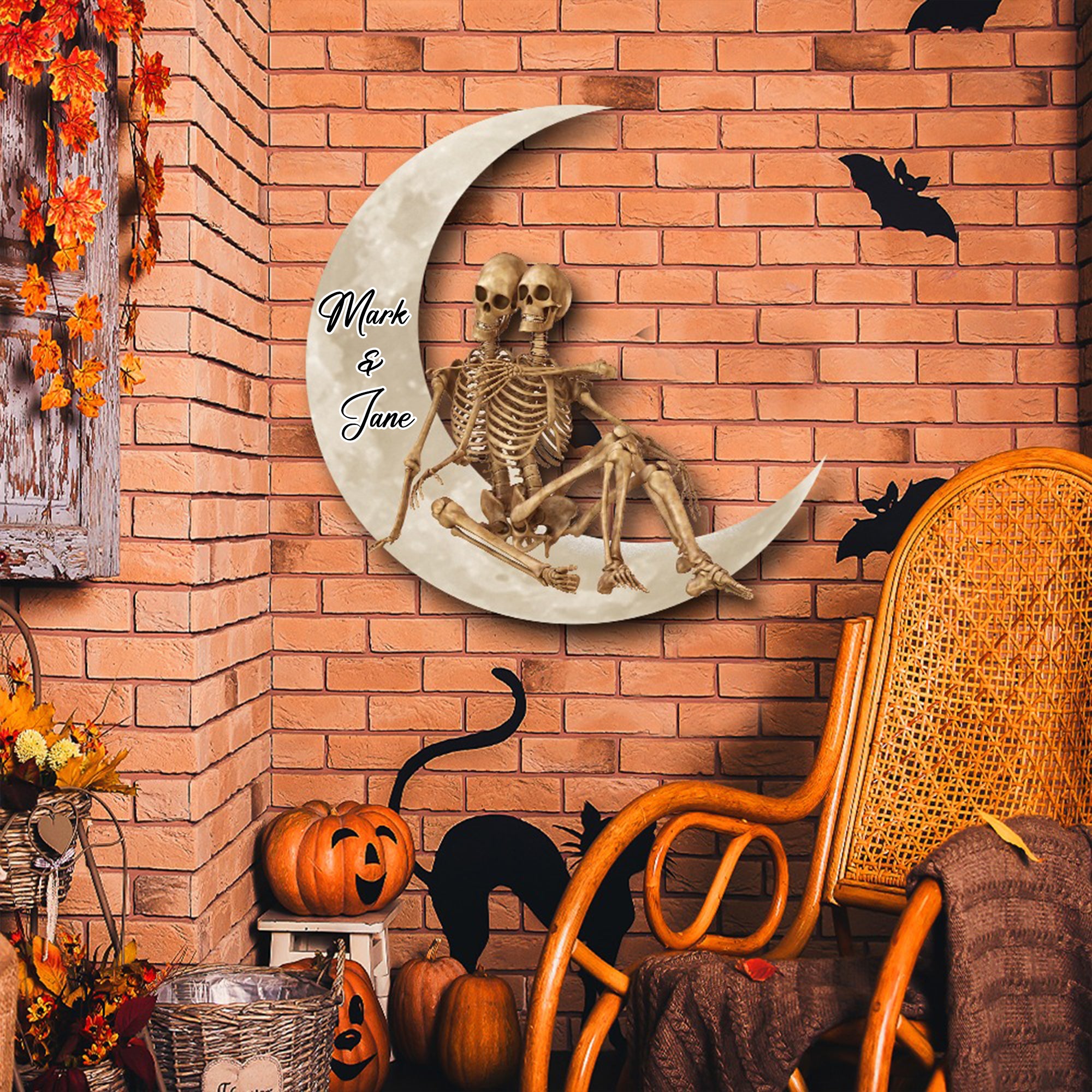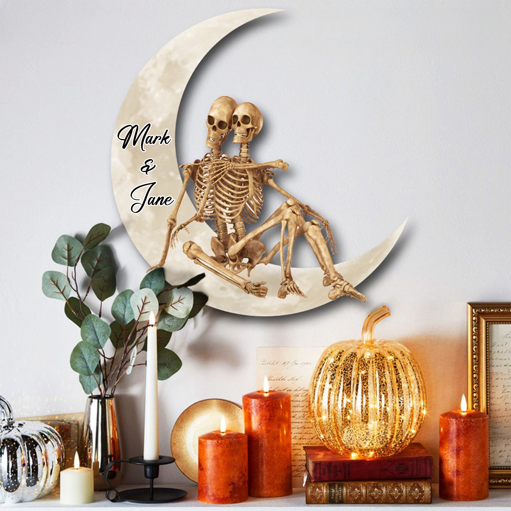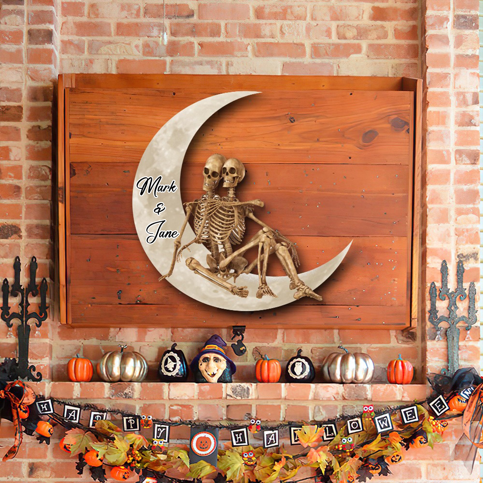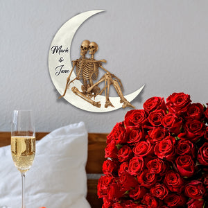 Skull Skeleton Couple On Crescent Moon Custom Valentine Wood Sign, Halloween Wood Sign, Valentine Gift Ideas