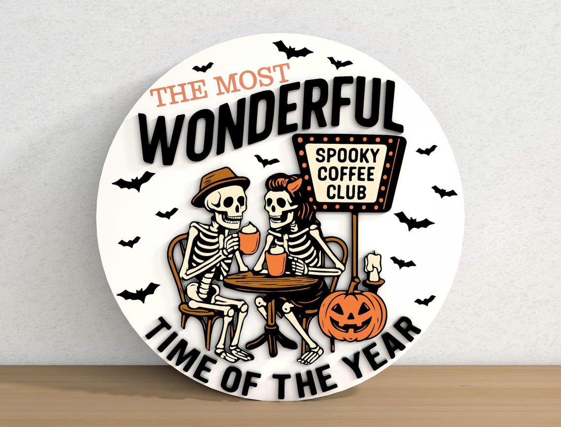 Spooky Coffee Skeleton Pumpkin Wood Signs Outdoor, Halloween Door Hanger, Halloween Door Decor