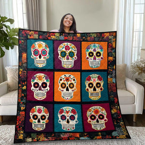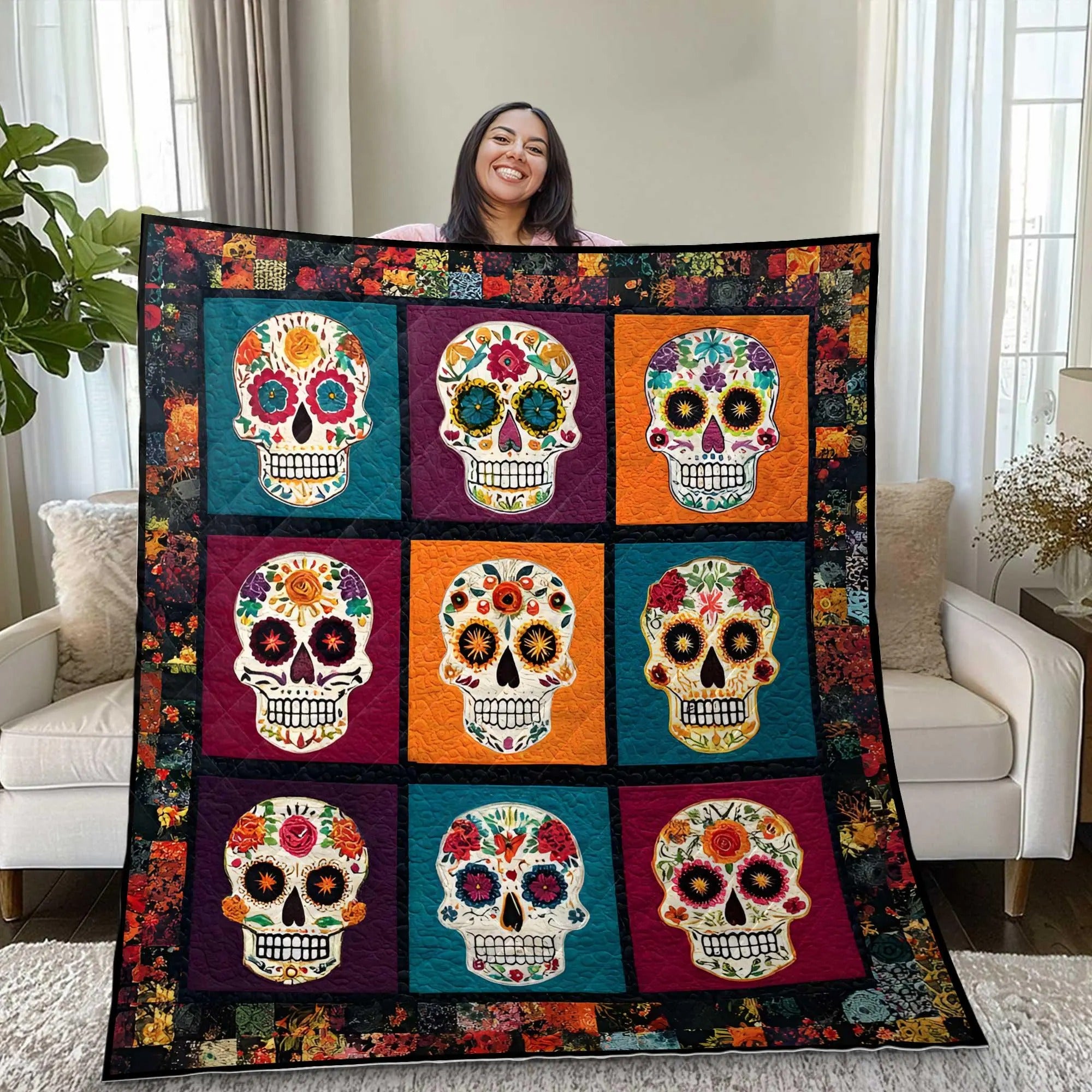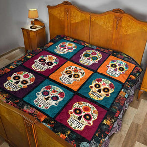 Sugar Skull Quilt Blanket, Mexican Day Of The Dead Blankets, King Size Blanket