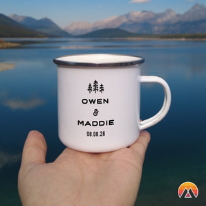 Cozy up next to the campfire with your special someone + sip on your favorite drink with our personalized Mountain Hiking Couple enamel mug. Perfect for an engagement party, bridal shower, elopement, or anniversary. Makes a unique wedding keepsake for the adventurous, outdoorsy couple to celebrate their love.